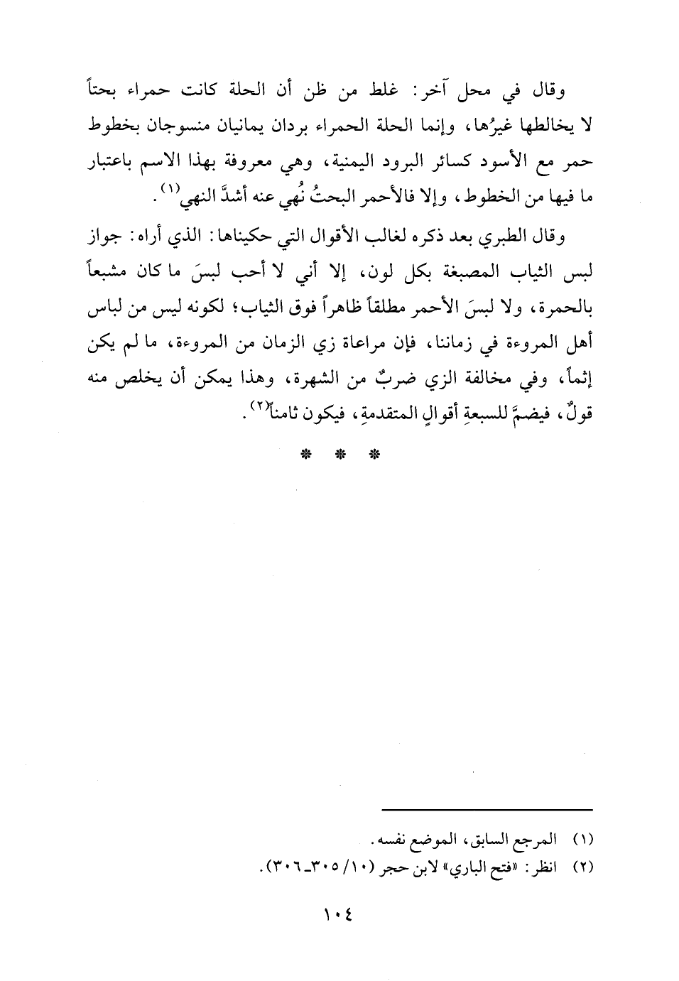 وقال الطبري بعد ذكره لغالب الأقوال التي حكيناها: الذي أراه: جواز لبس الثياب المصبغة بكل لون، إلا أني لا أحب لبسَ ما كان مشبعًا بالحمرة، ولا لبسَ الأحمر مطلقا ظاهرًا فوق الثياب؛ لكونه ليس من لباس أهل المروءة في زماننا، فإن مراعاة زي الزمان من المروءة، ما لم يكن إثمًا، وفي مخالفة الزي ضربٌ من الشهرة، وهذا يمكن أن يخلص منه قولٌ، فيضمَّ للسبعةِ أقوالٍ المتقدمةِ، فيكون ثامنًا (٢).