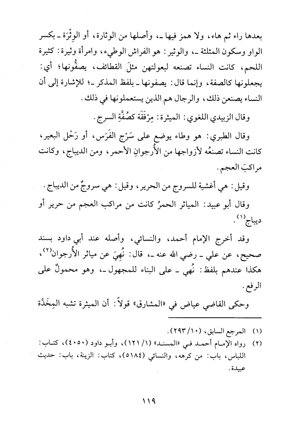 بعدها راء ثم هاء، ولا همز فيها-، وأصلها من الوثارة، أو الوِثْرَة -بكسر الواو وسكون المثلثة-، والوثير: هو الفراش الوطيء، وامرأة وثيرة: كثيرة اللحم، كانت النساء تصنعه لبعولتهن مثلَ القطائف، يصفُّونها؛ أي: يجعلونها كالصفة، وإنما قال: يصفونها -بلفظ المذكر-؛ للإشارة إلى أن النساء يصنعن ذلك، والرجال هم الذين يستعملونها في ذلك.