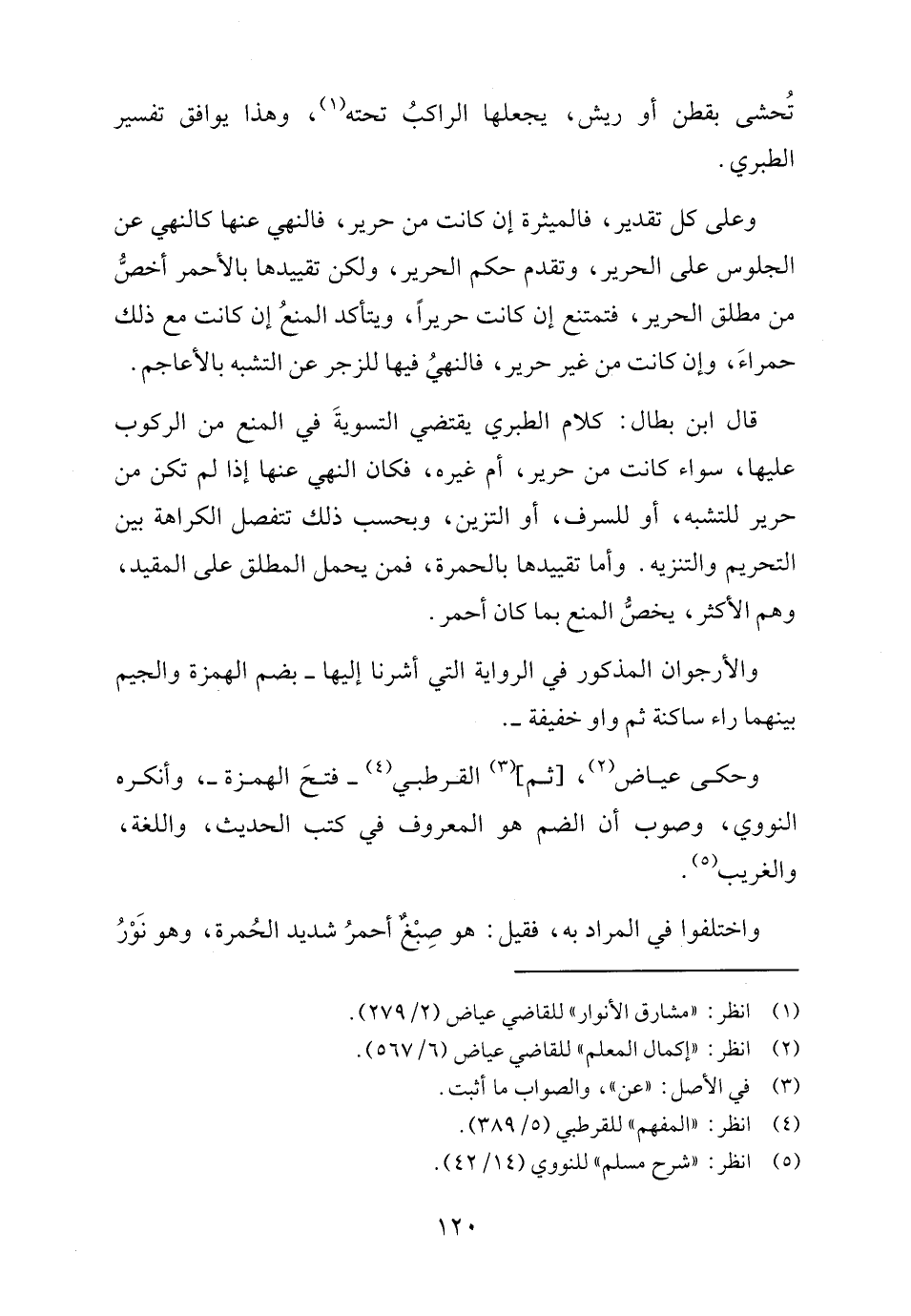 قال ابن بطال: كلام الطبري يقتضي التسويةَ في المنع من الركوب عليها، سواء كانت من حرير، أم غيره، فكان النهي عنها إذا لم تكن من حرير للتشبه، أو للسرف، أو التزين، وبحسب ذلك تتفصل الكراهة بين التحريم والتنزيه. وأما تقييدها بالحمرة، فمن يحمل المطلق على المقيد، وهم الأكثر، يخصُّ المنع بما كان أحمر.