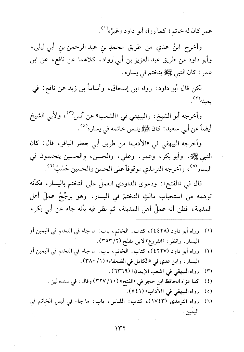 وأخرج ابنُ عدي من طريق محمدِ بنِ عبد الرحمن بنِ أبي ليلى، وأبو داود من طريق عبد العزيز بن أبي رواد، كلاهما عن نافع، عن ابن عمر: كان النبي - صلى الله عليه وسلم - يتختم في يساره.