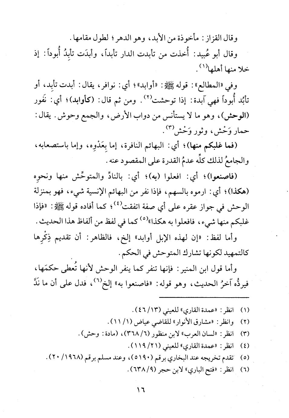وفي "المطالع": قوله - صلى الله عليه وسلم -: "أوابد"؛ أي: نوافر، يقال: أبدت تأبِد، أو تأبُد أُبودًا فهي آبدة: إذا توحشت (٢). ومن ثم قال: (كأوابد)؛ أي: نَفور (الوحش)، وهو ما لا يستأنس من دواب الأرض، والجمع وحوش. يقال: حمار وَحْش، وثور وَحْش (٣).