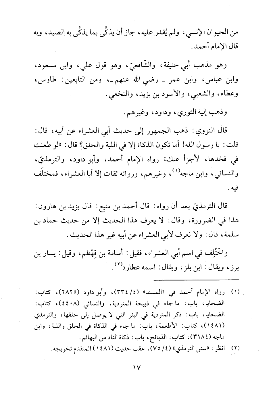 قال النووي: ذهب الجمهور إلى حديث أبي العشراء عن أبيه، قال: قلت: يا رسول الله! أما تكون الذكاة إلَّا في اللبة والحلق؟ قال: "لو طعنت في فخذها، لأجزأ عنك" رواه الإمام أحمد، وأبو داود، والتِّرمذيُّ، والنَّسائيُّ، وابن ماجه (١)، وغيرهم، ورواته ثقات إلَّا أبا العشراء، فمختلَف فيه.