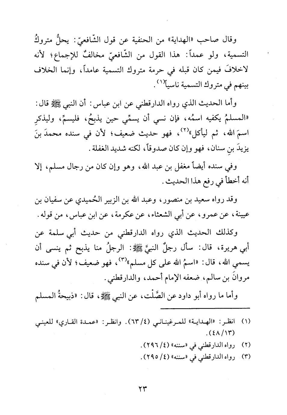 وأما الحديث الذي رواه الدارقطني عن ابن عباس: أن النَّبيُّ - صلى الله عليه وسلم - قال: "المسلمُ يكفيه اسمُه، فإن نسي أن يسمِّي حين يذبحُ، فليسمِّ، وليذكرِ اسمَ الله، ثم ليأكل" (٢)، فهو حديث ضعيف؛ لأنَّ في سنده محمدَ بنَ يزيدَ بنِ سنان، فهو وإن كان صدوقًا، لكنه شديد الغفلة.
