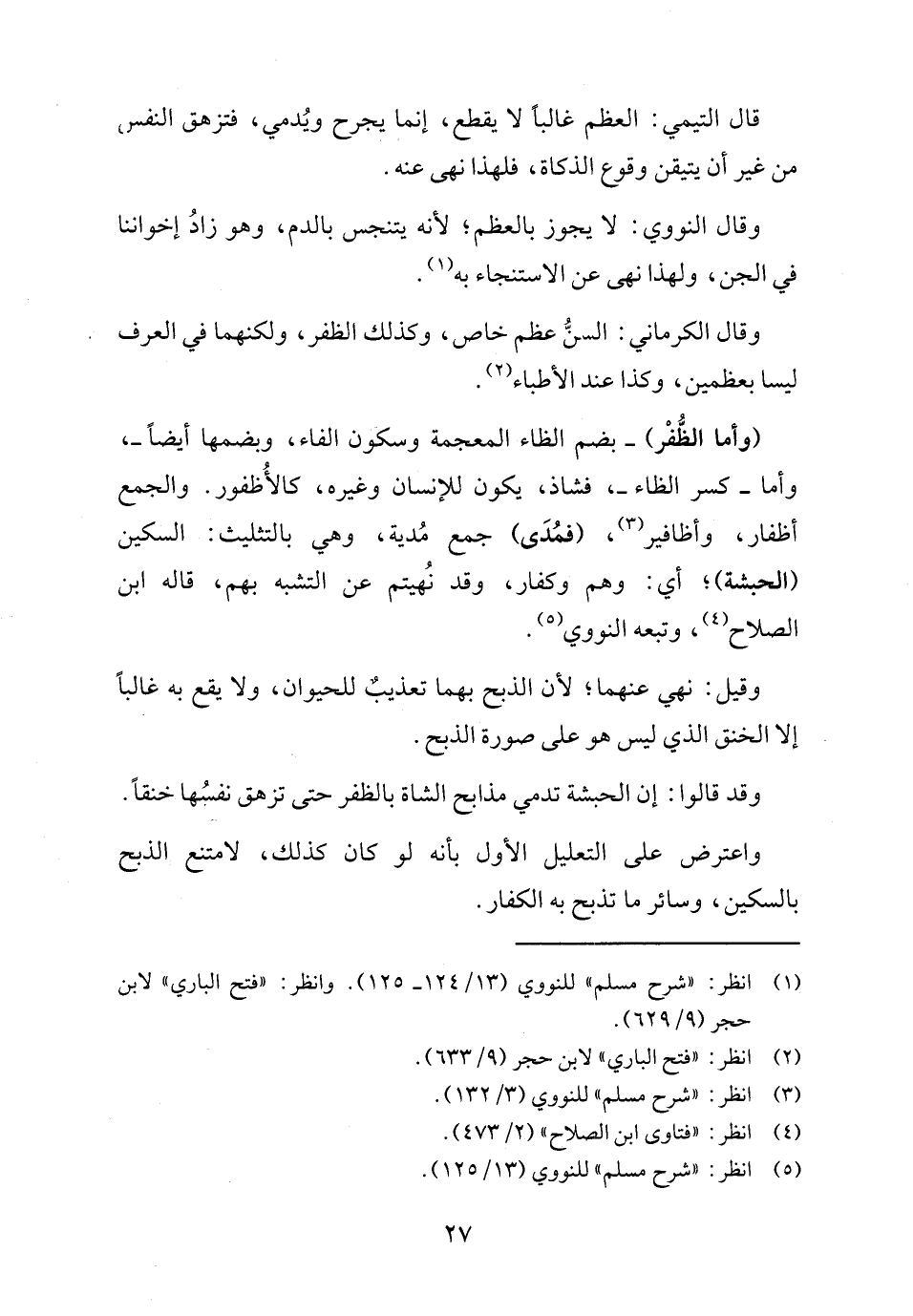 واعترض على التعليل الأول بأنه لو كان كذلك، لامتنع الذبح بالسكين، وسائر ما تذبح به الكفار.