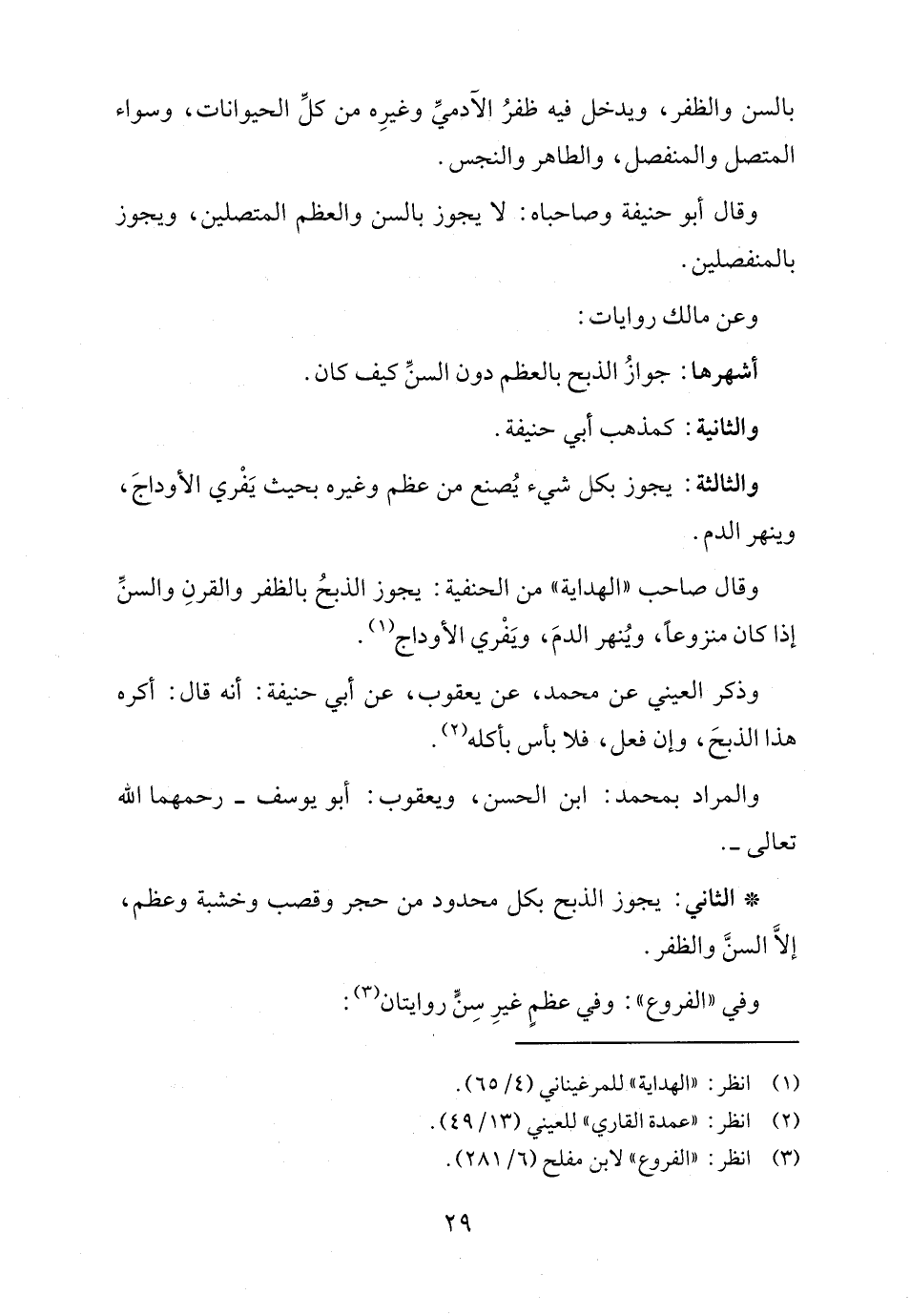 بالسن والظفر، ويدخل فيه ظفرُ الآدميِّ وغيرِه من كلِّ الحيوانات، وسواء المتصل والمنفصل، والطاهر والنجس.