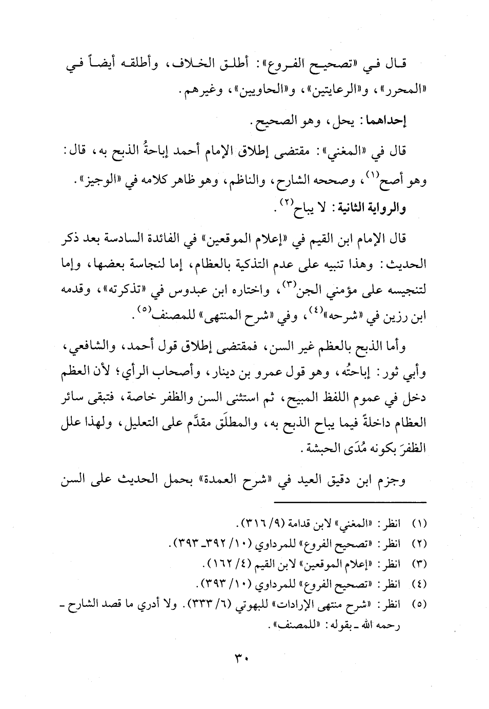 قال الإمام ابن القيم في "إعلام الموقعين" في الفائدة السادسة بعد ذكر الحديث: وهذا تنبيه على عدم التذكية بالعظام، إما لنجاسة بعضها، وإما لتنجيسه على مؤمني الجن (٣)، واختاره ابن عبدوس في "تذكرته"، وقدمه ابن رزين في "شرحه" (٤)، وفي "شرح المنتهى" للمصنف (٥).