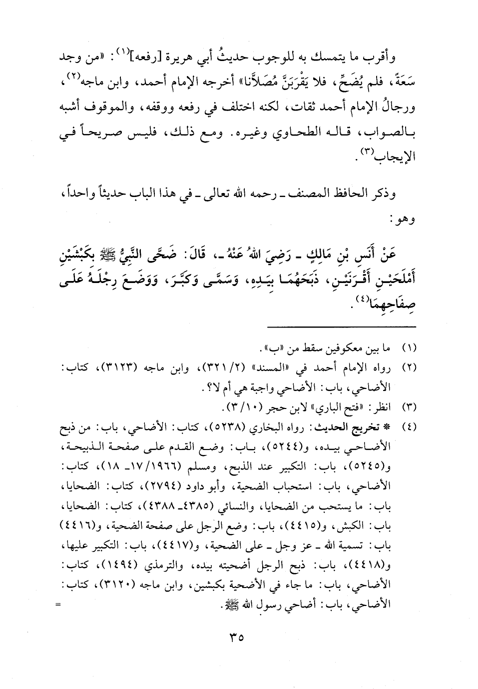 وأقرب ما يتمسك به للوجوب حديثُ أبي هريرة [رفعه] (١): "من وجد سَعَةً، فلم يُضَحِّ، فلا يَقْرَبَنَّ مُصَلَّانا" أخرجه الإمام أحمد، وابن ماجه (٢)، ورجالُ الإمام أحمد ثقات، لكنه اختلف في رفعه ووقفه، والموقوف أشبه بالصواب، قاله الطحاوي وغيره. ومع ذلك، فليس صريحًا في الإيجاب (٣).