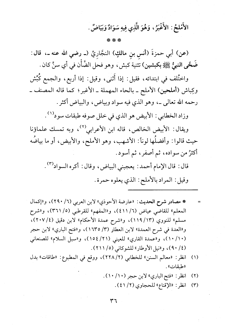واختُلف في ابتدائه، فقيل: إذا أَثنى، وقيل: إذا أربع، والجمع كُبُش وكِباش (أملحين) الأملح -بالحاء المهملة- الأغبر؛ كما قاله المصنف -رحمه الله تعالى-، وهو الذي فيه سواد وبياض، والبياض أكثر.