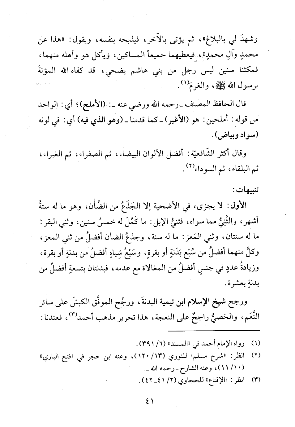 الأول: لا يجزىء في الأضحية إلَّا الجَذَعُ من الضَّأْن، وهو ما له ستةُ أشهر، والثَّنِيُّ مما سواه، فثنيُّ الإبل: ما كَمُلَ له خمسُ سنين، وثني البقر: ما له سنتان، وثني المَعز: ما له سنة، وجذعُ الضأن أفضلُ من ثني المعز، وكلٌّ منهما أفضلُ من سبع بَدَنةٍ أو بقرةٍ، وسَبع شِياهٍ أفضلُ من بدنةٍ أو بقرة، وزيادةُ عددٍ في جنسٍ أفضلُ من المغالاة مع عدمه، فبدنتان بتسعةٍ أفضلُ من بدنةٍ بعشرة.
