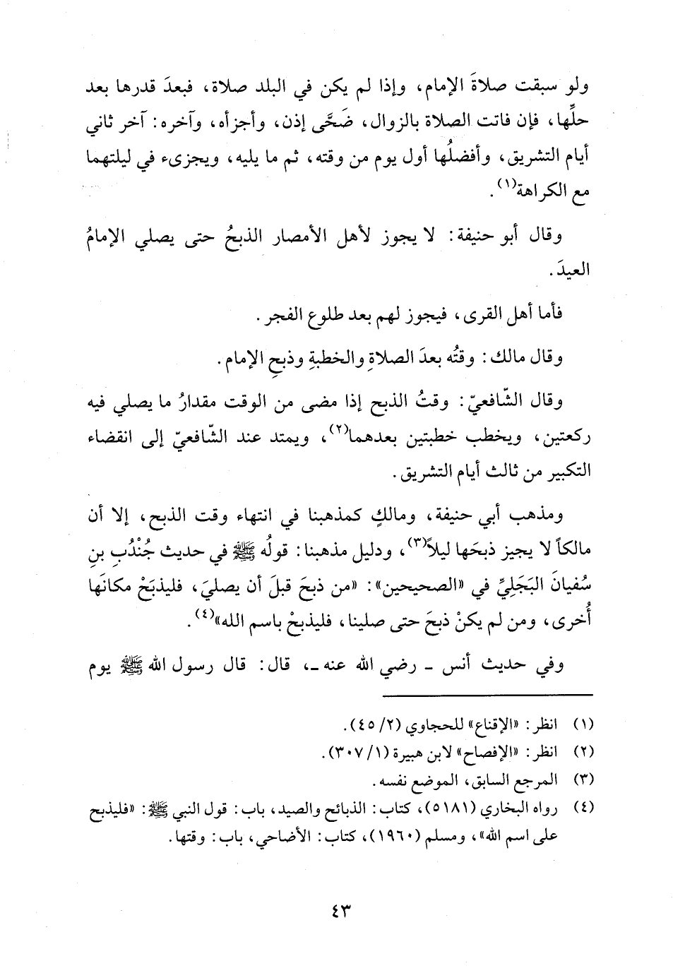ومذهب أبي حنيفة، ومالكٍ كمذهبنا في انتهاء وقت الذبح، إلَّا أن مالكًا لا يجيز ذبحَها ليلًا (٣)، ودليل مذهبنا: قولُه - صلى الله عليه وسلم - في حديث جُنْدُبِ بنِ سُفيانَ البَجَلِيِّ في "الصحيحين": "من ذبحَ قبلَ أن يصليَ، فليذبَحْ مكانَها أُخرى، ومن لم يكنْ ذبحَ حتَّى صلينا، فليذبحْ باسم الله" (٤).