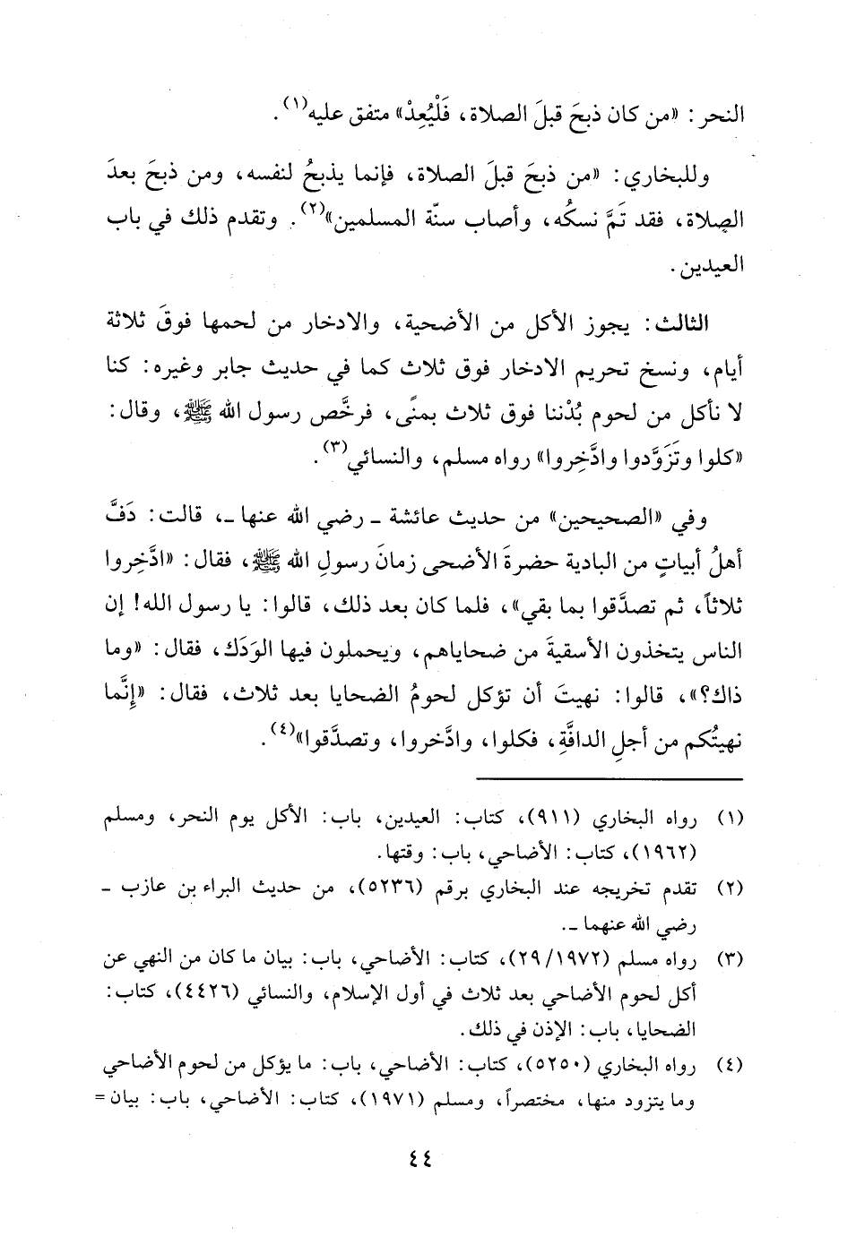 (٣) رواه مسلم (١٩٧٢/ ٢٩)، كتاب: الأضاحي، باب: بيان ما كان من النهي عن أكل لحوم الأضاحي بعد ثلاث في أول الإسلام، والنَّسائي (٤٤٢٦)، كتاب: الضحايا، باب: الإذن في ذلك.