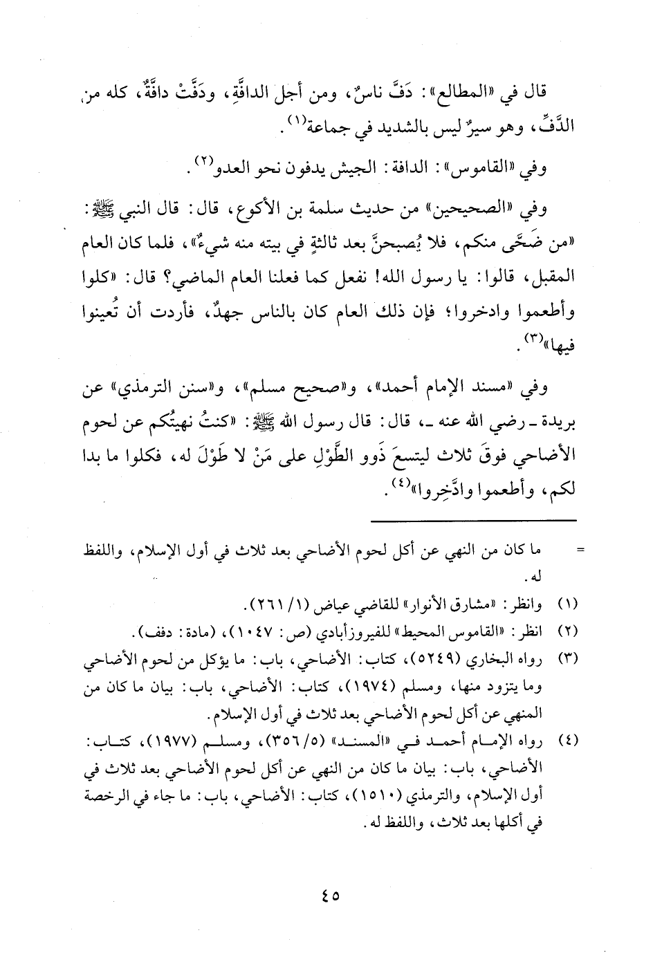 (٤) رواه الإمام أحمد في "المسند" (٥/ ٣٥٦)، ومسلم (١٩٧٧)، كتاب: الأضاحي، باب: بيان ما كان من النهي عن أكل لحوم الأضاحي بعد ثلاث في أول الإسلام، والترمذي (١٥١٠)، كتاب: الأضاحي، باب: ما جاء في الرخصة في أكلها بعد ثلاث، واللفظ له.