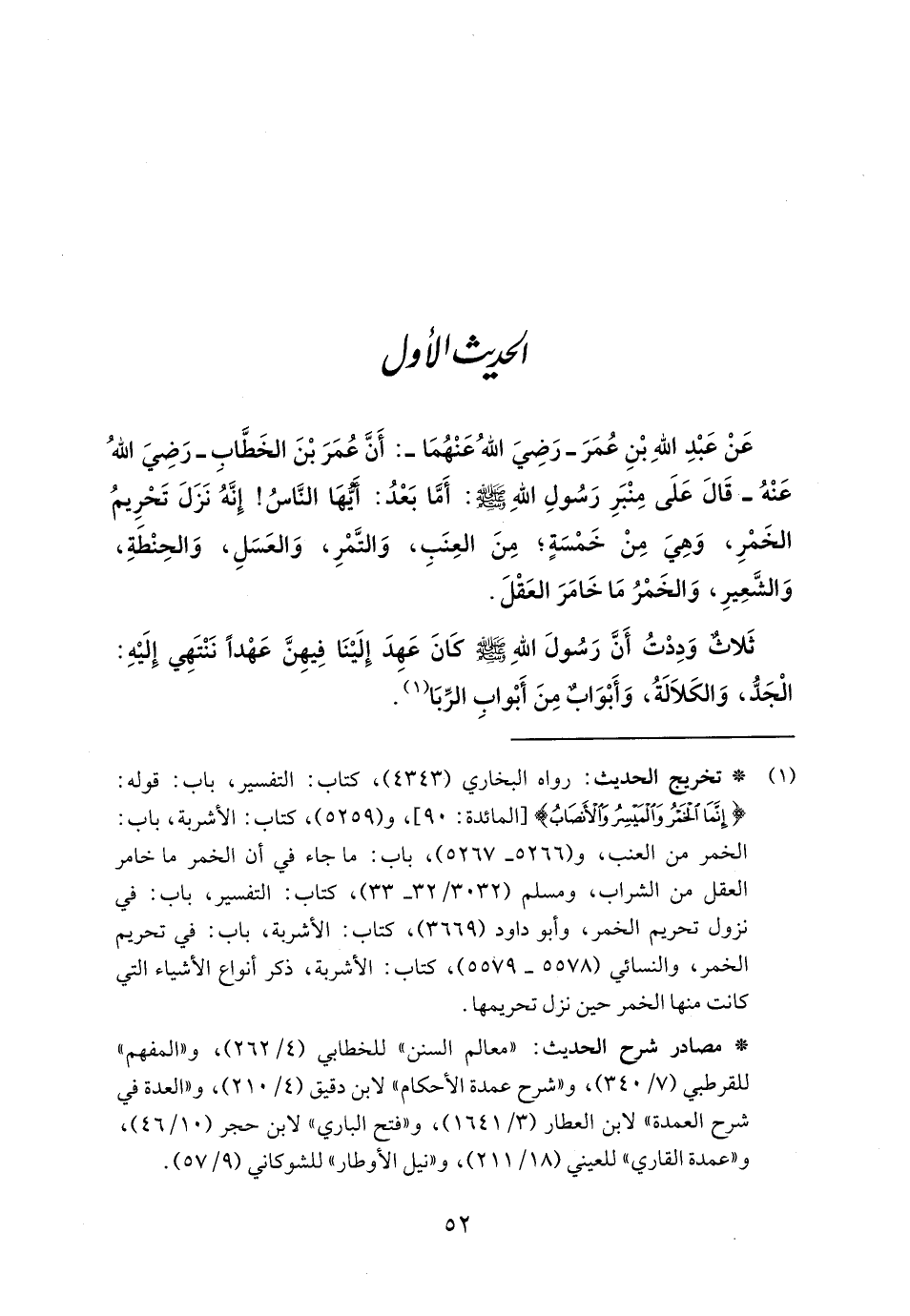 عَنْ عَبْدِ اللهِ بْنِ عُمَرَ -رَضِيَ اللهُ عَنْهُمَا-: أَنَّ عُمَرَ بْنَ الخَطَّابِ - رضي الله عنه - قَالَ عَلَى مِنْبَرِ رَسُولِ اللهِ - صلى الله عليه وسلم -: أَمَّا بَعْدُ: أَيُّها النَّاسُ! إِنَّهُ نَزَلَ تَحْرِيمُ الخَمْرِ، وَهِيَ مِنْ خَمْسَةٍ؛ مِنَ العِنَبِ، وَالتَّمْرِ، وَالعَسَلِ، وَالحِنْطَةِ، وَالشَّعِيرِ، وَالخَمْرُ مَا خَامَرَ العَقْلَ.