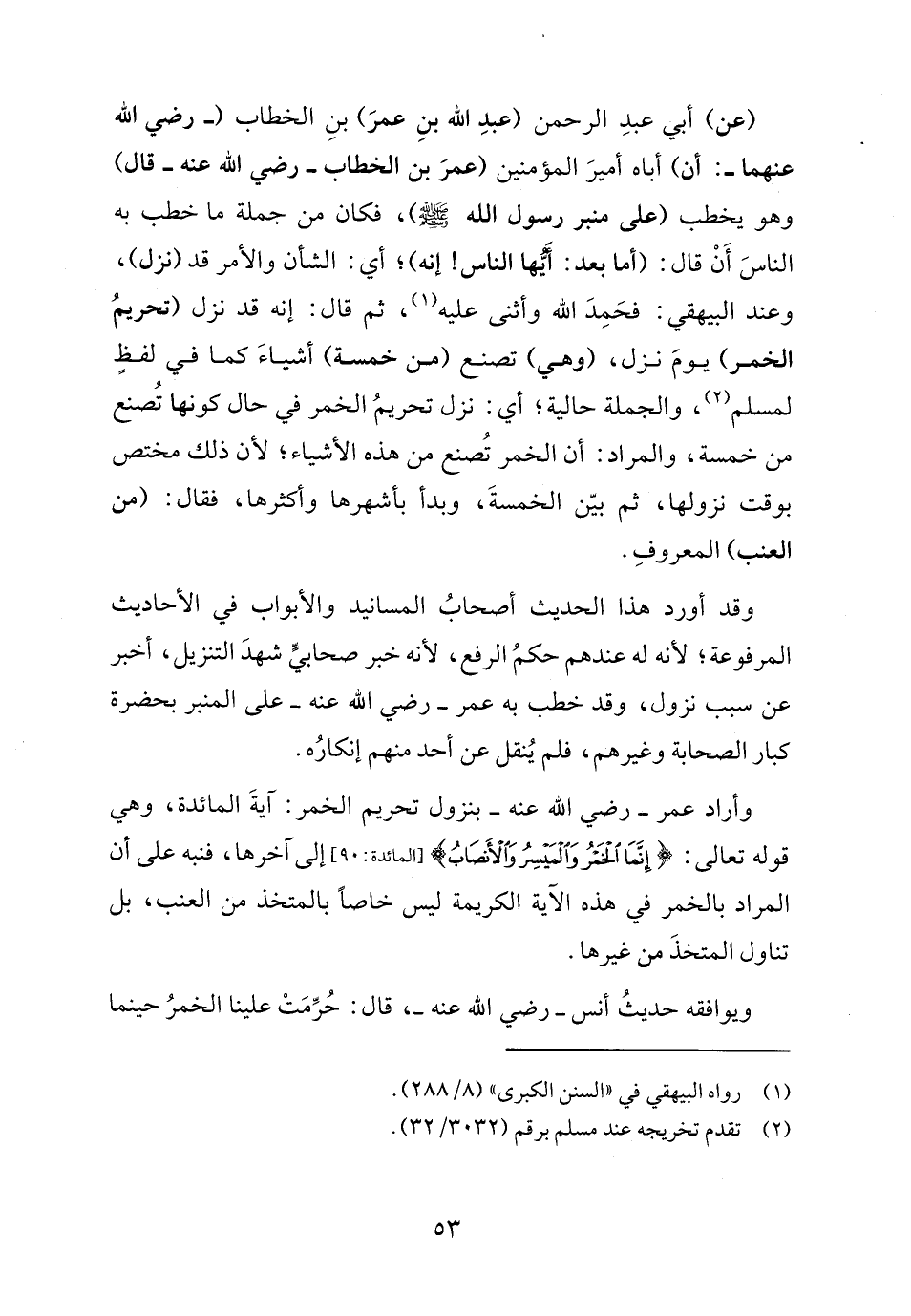 (عن) أبي عبدِ الرحمن (عبدِ الله بنِ عمرَ) بنِ الخطاب (-رضي الله عنهما-: أن) أباه أميرَ المؤمنين (عمرَ بن الخطاب - رضي الله عنه - قال) وهو يخطب (على منبر رسول الله - صلى الله عليه وسلم -)، فكان من جملة ما خطب به النَّاسَ أَنْ قال: (أما بعد: أيُّها النَّاس! إنه)؛ أي: الشأن والأمر قد (نزل)، وعند البيهقي: فحَمِدَ الله وأثنى عليه (١)، ثم قال: إنه قد نزل (تحريمُ الخمر) يومَ نزل، (وهي) تصنع (من خمسة) أشياءَ كما في لفظٍ لمسلم (٢)، والجملة حالية؛ أي: نزل تحريمُ الخمر في حال كونها تُصنع من خمسة، والمراد: أن الخمر تُصنع من هذه الأشياء؛ لأنَّ ذلك مختص بوقت نزولها، ثم بيّن الخمسةَ، وبدأ بأشهرها وأكثرها، فقال: (من العنب) المعروفِ.