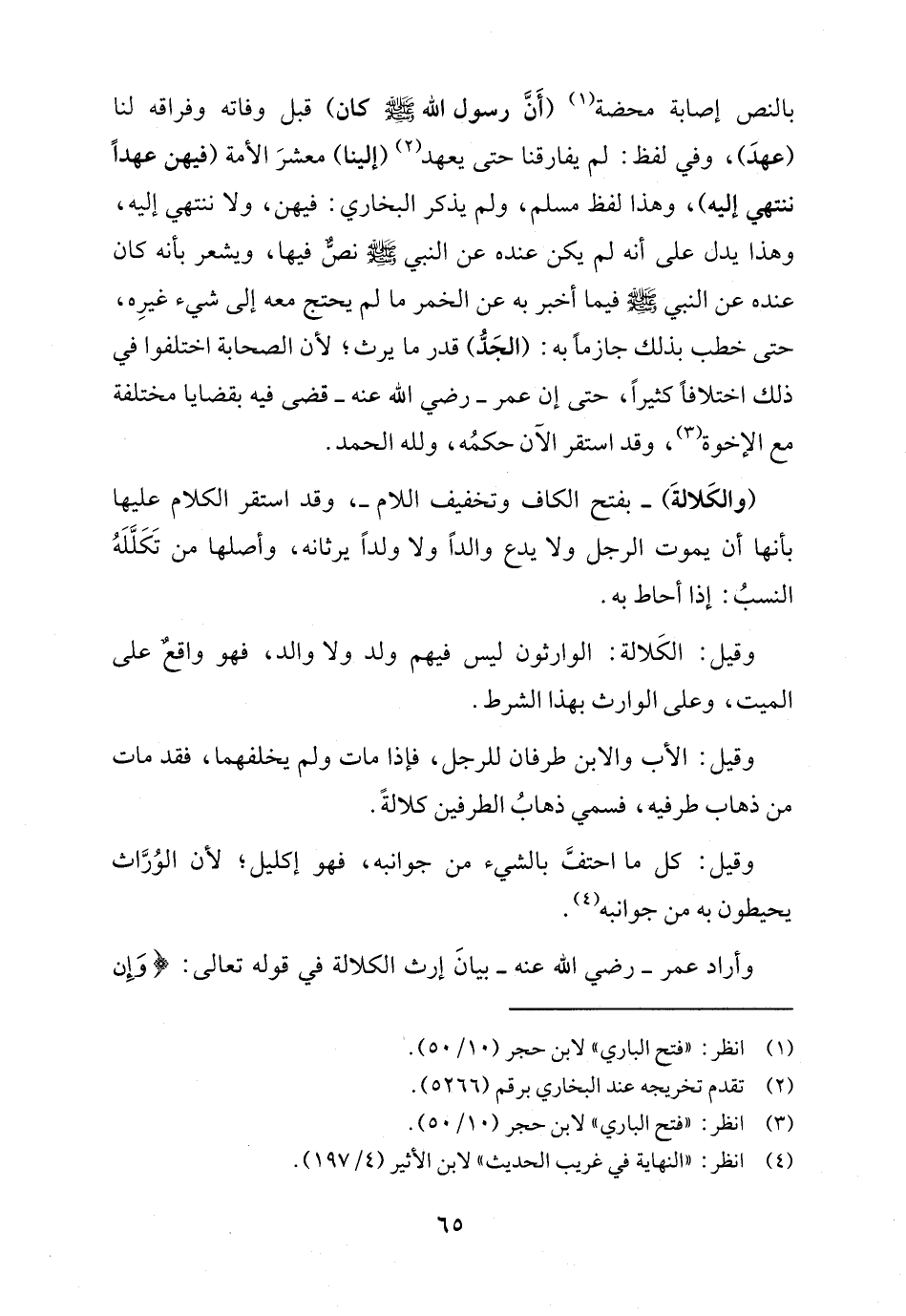 (والكَلالةَ) -بفتح الكاف وتخفيف اللام-، وقد استقر الكلام عليها بأنها أن يموت الرجل ولا يدع والدًا ولا ولدًا يرثانه، وأصلها من تَكَلَّلَهُ النسبُ: إذا أحاط به.