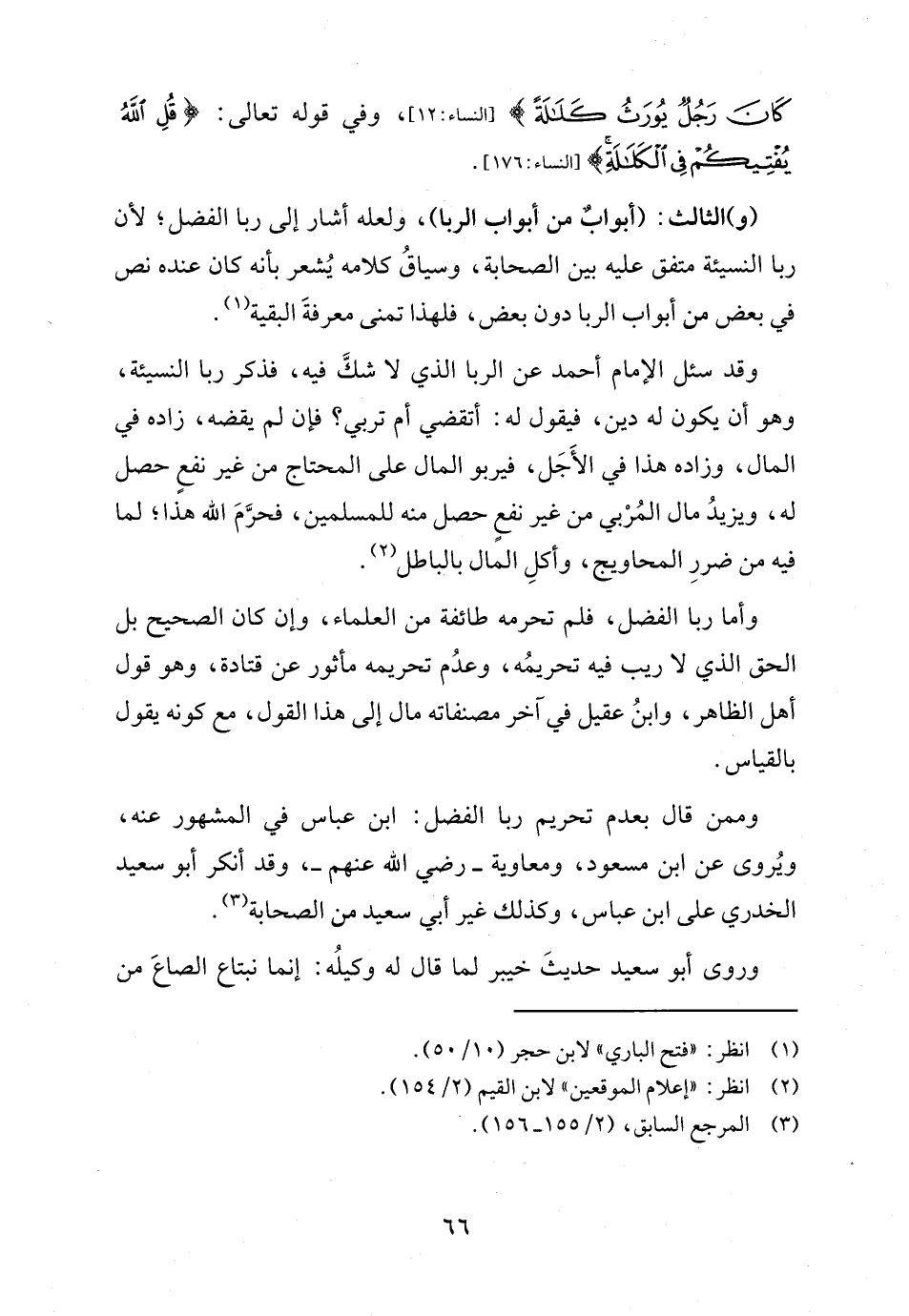 وأما ربا الفضل، فلم تحرمه طائفة من العلماء، وإن كان الصحيح بل الحق الذي لا ريب فيه تحريمُه، وعدُم تحريمه مأثور عن قتادة، وهو قول أهل الظاهر، وابنُ عقيل في آخر مصنفاته مال إلى هذا القول، مع كونه يقول بالقياس.