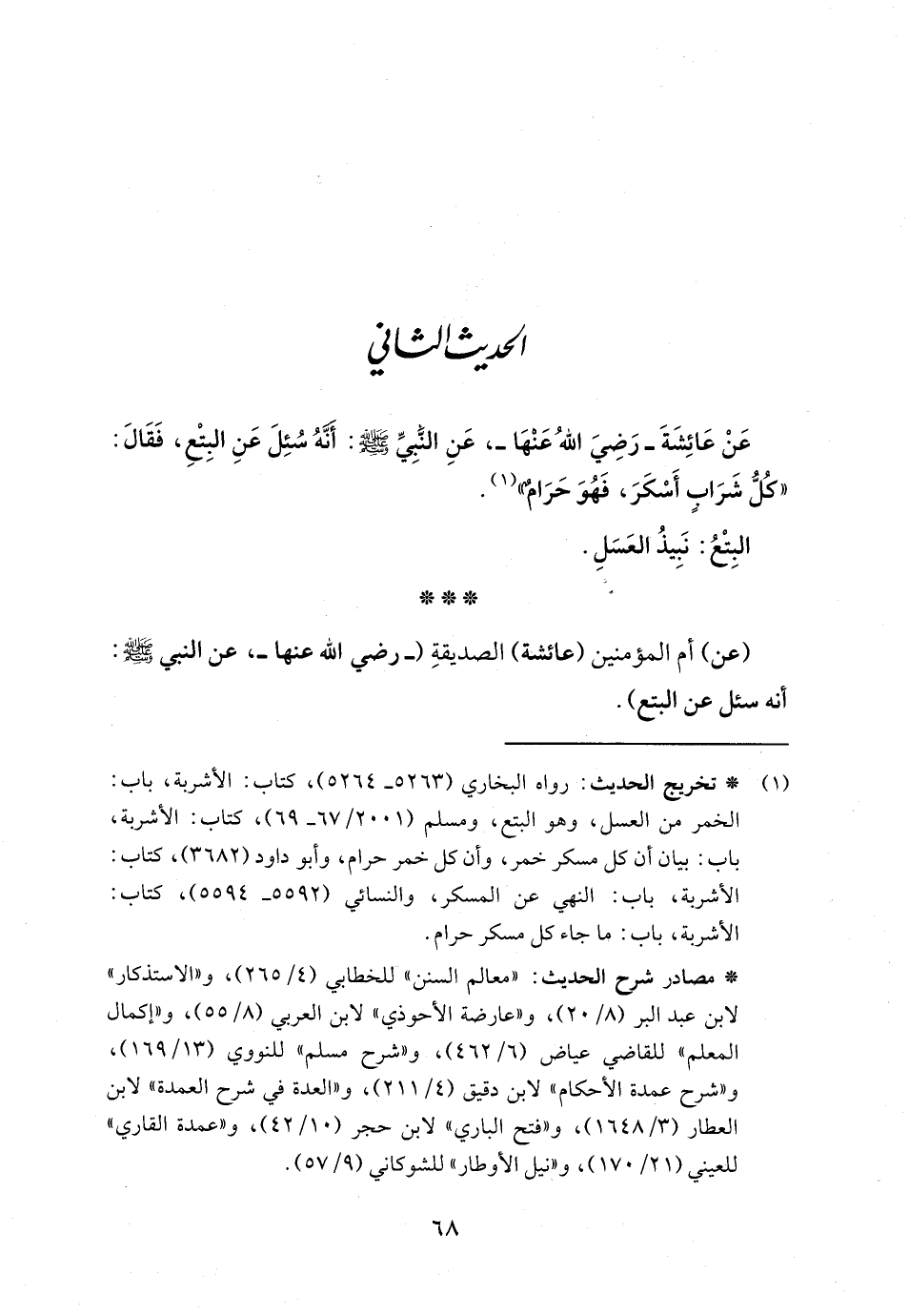 عَنْ عَائِشَةَ -رَضِيَ اللهُ عَنْهَا-، عَنِ النَّبِيِّ - صلى الله عليه وسلم -: أَنَّهُ سُئِلَ عَنِ البِتع، فَقَالَ: "كُلُّ شَرَابٍ أَسْكَرَ، فَهُوَ حَرَامٌ" (١).