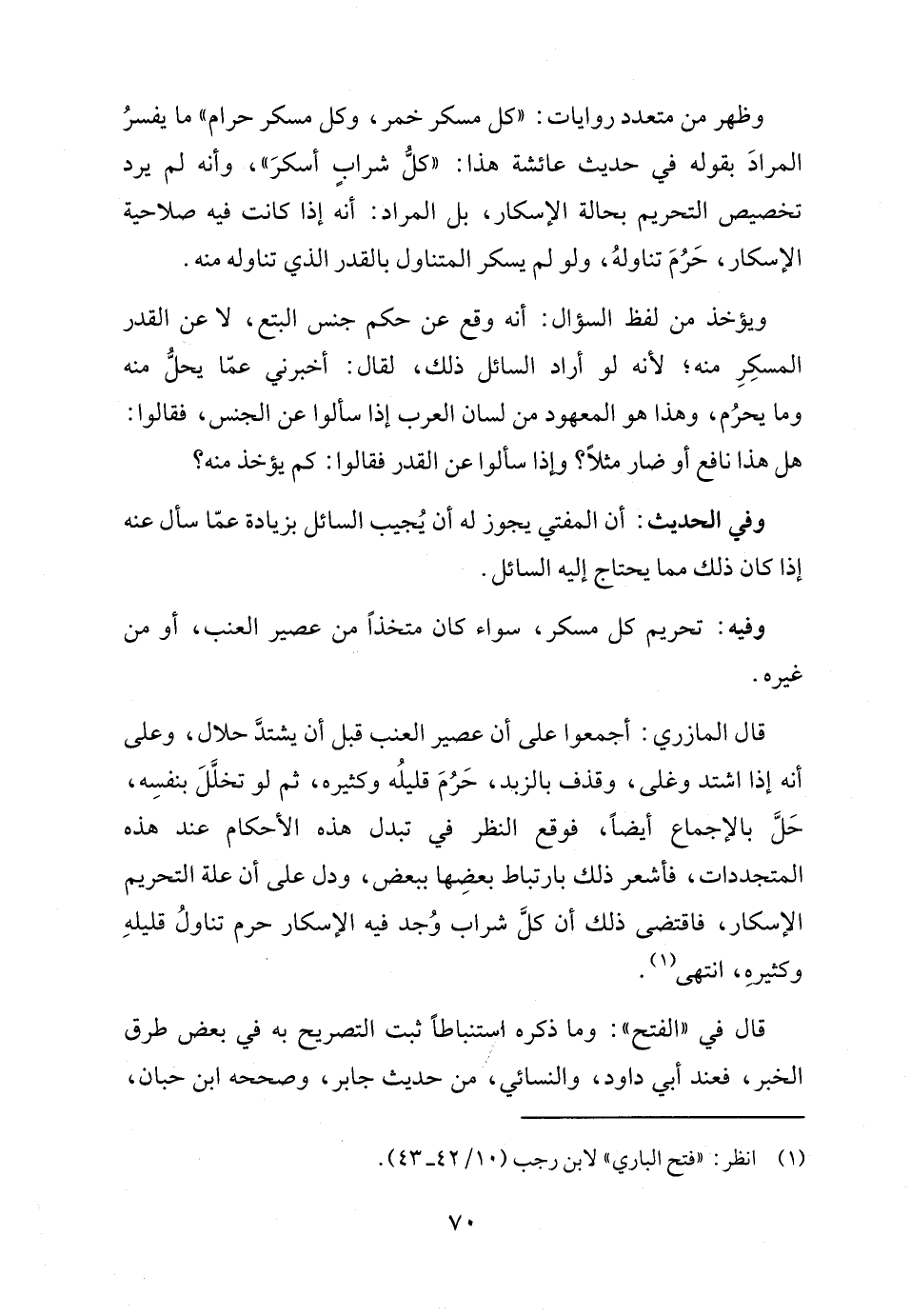وظهر من متعدد روايات: "كل مسكر خمر، وكل مسكر حرام" ما يفسرُ المرادَ بقوله في حديث عائشة هذا: "كلُّ شرابٍ أسكرَ"، وأنه لم يرد تخصيص التحريم بحالة الإسكار، بل المراد: أنه إذا كانت فيه صلاحية الإسكار، حَرُمَ تناولهُ، ولو لم يسكر المتناول بالقدر الذي تناوله منه.