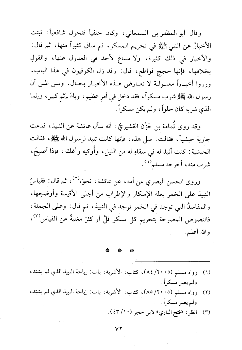 وقال أبو المظفر بن السمعاني، وكان حنفيًا فتحول شافعيًا: ثبتت الأخبارُ عن النَّبيُّ - صلى الله عليه وسلم - في تحريم المسكر، ثم ساق كثيرًا منها، ثم قال: والأخبار في ذلك كثيرة، ولا مساغ لأحد في العدول عنها، والقول بخلافها، فإنها حجج قواطع، قال: وقد زل الكوفيون في هذا الباب، ورووا أخبارًا معلولة لا تعارض هذه الأخبار بحال، ومن ظن أن رسول الله - صلى الله عليه وسلم - شرب مسكرًا، فقد دخل في أمرٍ عظيم، وباءَ بإثمٍ كبير، وإنما الذي شربه كان حلوًا، ولم يكن مسكرًا.