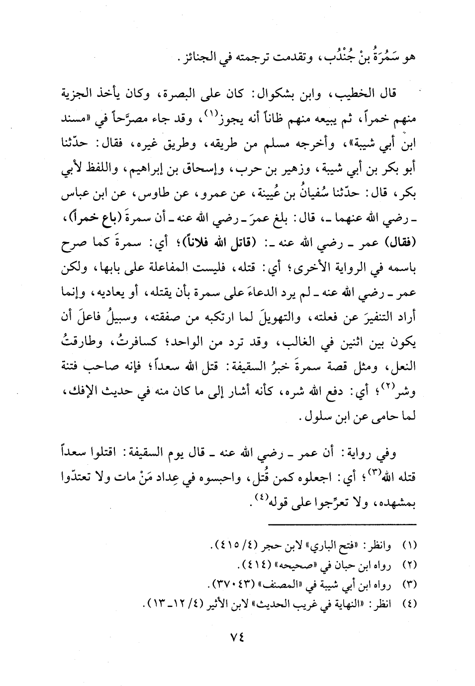 قال الخطيب، وابن بشكوال: كان على البصرة، وكان يأخذ الجزية منهم خمرًا، ثم يبيعه منهم ظانًا أنه يجوز (١)، وقد جاء مصرَّحًا في "مسند ابنَ أبي شيبة"، وأخرجه مسلم من طريقه، وطريق غيره، فقال: حدّثنا أبو بكر بن أبي شيبة، وزهير بن حرب، وإسحاق بن إبراهيم، واللفظ لأبي بكر، قال: حدّثنا سُفيانُ بن عُيينة، عن عمرو، عن طاوس، عن ابن عباس -رضي الله عنهما-، قال: بلغ عمرَ - رضي الله عنه - أن سمرةَ (باع خمرًا)، (فقال) عمر - رضي الله عنه -: (قاتل الله فلانًا)؛ أي: سمرةَ كما صرح باسمه في الرواية الأخرى؛ أي: قتله، فليست المفاعلة على بابها، ولكن عمر - رضي الله عنه - لم يرد الدعاءَ على سمرة بأن يقتله، أو يعاديه، وإنما أراد التنفيرَ عن فعلته، والتهويلَ لما ارتكبه من صفقته، وسبيلُ فاعلَ أن يكون بين اثنين في الغالب، وقد ترد من الواحد؛ كسافرتُ، وطارقتُ النعل، ومثل قصة سمرةَ خبرُ السقيفة: قتل الله سعدًا؛ فإنّه صاحب فتنة وشر (٢)؛ أي: دفع الله شره، كأنه أشار إلى ما كان منه في حديث الإفك، لما حامى عن ابن سلول.