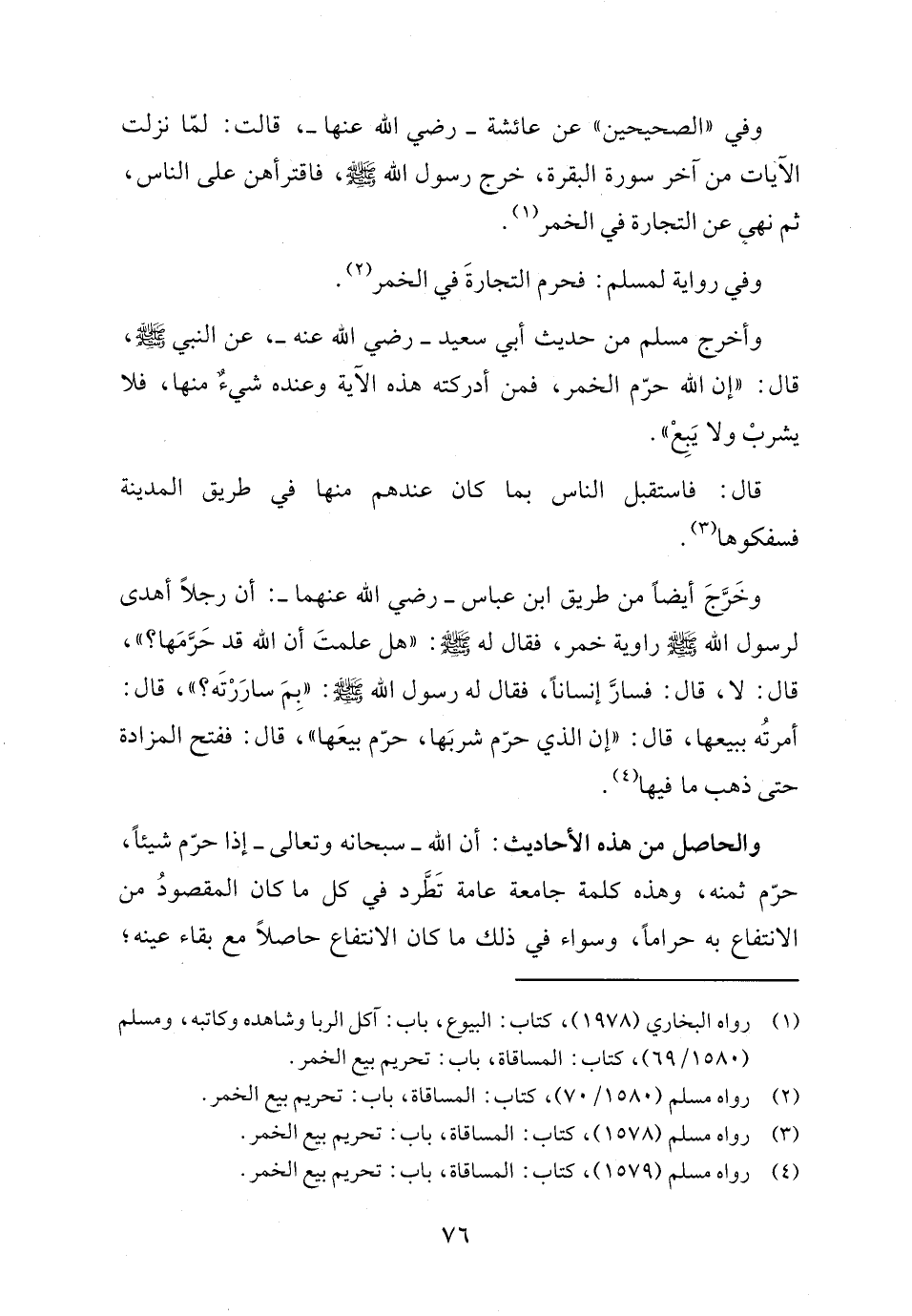 (١) رواه البُخاريّ (١٩٧٨)، كتاب: البيوع، باب: آكل الربا وشاهده وكاتبه، ومسلم (١٥٨٠/ ٦٩)، كتاب: المساقاة، باب: تحريم بيع الخمر.