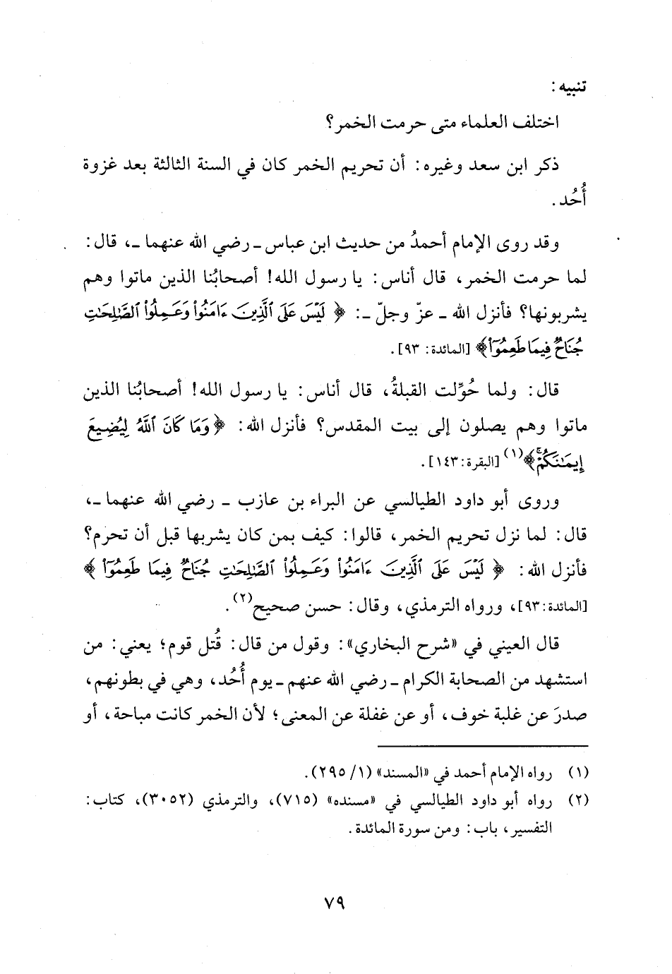 وروى أبو داود الطَّيالسيُّ عن البراء بن عازب -رضي الله عنهما-، قال: لما نزل تحريم الخمر، قالوا: كيف بمن كان يشربها قبل أن تحرم؟ فأنزل الله: {لَيْسَ عَلَى الَّذِينَ آمَنُوا وَعَمِلُوا الصَّالِحَاتِ جُنَاحٌ فِيمَا طَعِمُوا} [المائدة: ٩٣] ورواه الترمذي، وقال: حسن صحيح (٢).