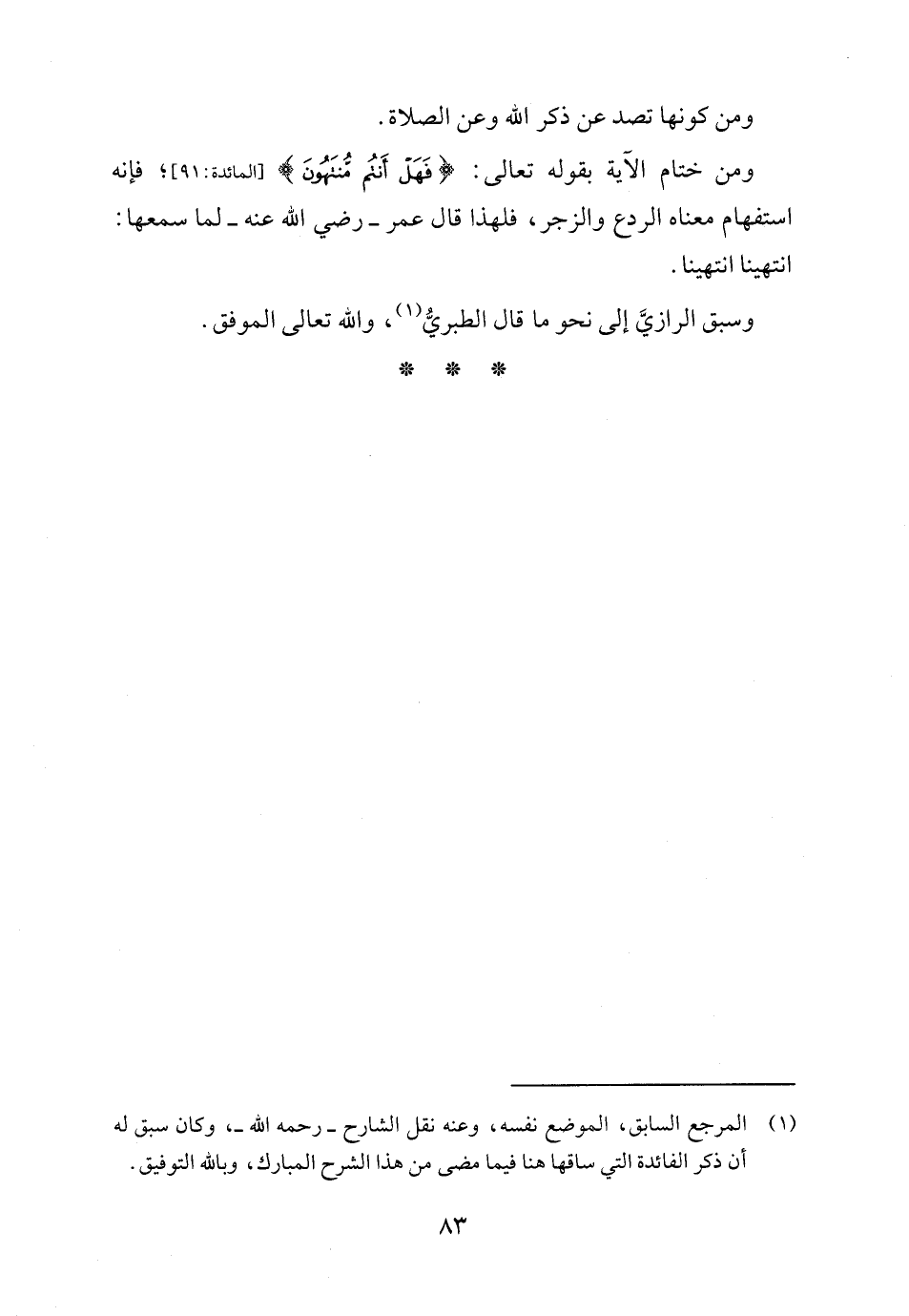ومن ختام الآية بقوله تعالى: {فَهَلْ أَنْتُمْ مُنْتَهُونَ} [المائدة: ٩١]؛ فإنّه استفهام معناه الردع والزجر، فلهذا قال عمر - رضي الله عنه - لما سمعها: انتهينا انتهينا.