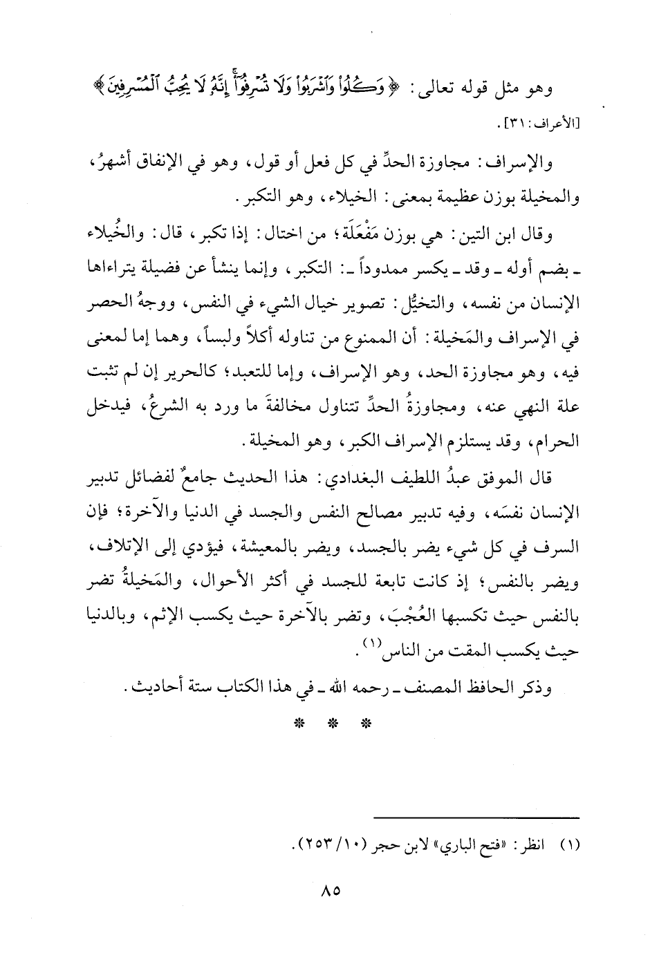 قال الموفق عبدُ اللطيف البغدادي: هذا الحديث جامعٌ لفضائل تدبير الإنسان نفسَه، وفيه تدبير مصالح النفس والجسد في الدنيا والآخرة؛ فإن السرف كل شيء يضر بالجسد، ويضر بالمعيشة، فيؤدي إلى الإتلاف، ويضر بالنفس؛ إذ كانت تابعة للجسد في أكثر الأحوال، والمَخيلةُ تضر بالنفس حيث تكسبها العُجْبَ، وتضر بالآخرة حيث يكسب الإثم، وبالدنيا حيث يكسب المقت من النَّاس (١).