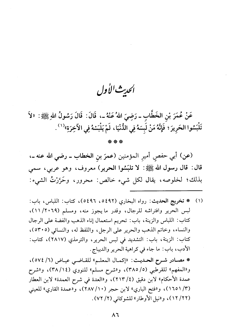 (عن) أبي حفصٍ أميرِ المؤمنين (عمرَ بنِ الخطاب - رضي الله عنه -، قال: قال رسول الله - صلى الله عليه وسلم -: لا تلبَسُوا الحرير) معروف، وهو عربي، سمي بذلك؛ لخلوصه، يقال لكل شيء خالص: محرور، وحَرَّرْتُ الشيء: