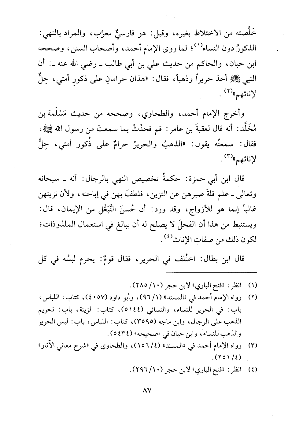 خَلَّصته من الاختلاط بغيره، وقيل: هو فارسيٌّ معرَّب، والمراد بالنهي: الذكورُ دون النساء (١)؛ لما روى الإمام أحمد، وأصحاب السنن، وصححه ابن حبان، والحاكم من حديث عليّ بن أبي طالب - رضي الله عنه -: أن النَّبي - صلى الله عليه وسلم - أخذ حريرًا وذهبًا، فقال: "هذان حرامانِ على ذكورِ أمتي، حِلٌّ لإناثهم" (٢).