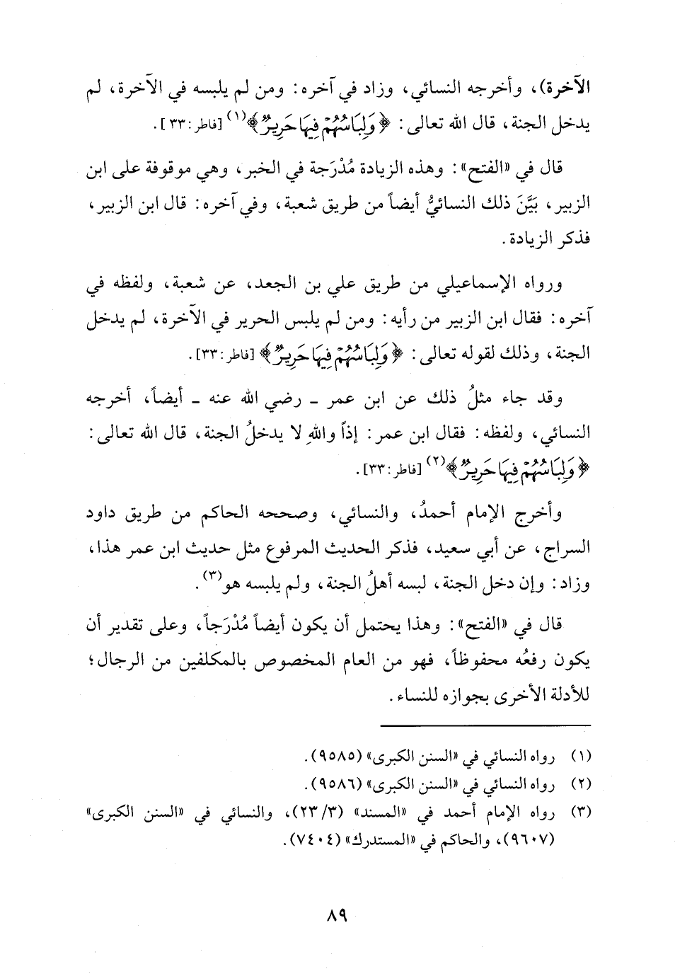 وقد جاء مثلُ ذلك عن ابن عمر - رضي الله عنه - أيضًا، أخرجه النَّسائي، ولفظه: فقال ابن عمر: إذًا واللهِ لا يدخلُ الجنة، قال الله تعالى: {وَلِبَاسُهُمْ فِيهَا حَرِيرٌ} (٢) [فاطر: ٣٣].