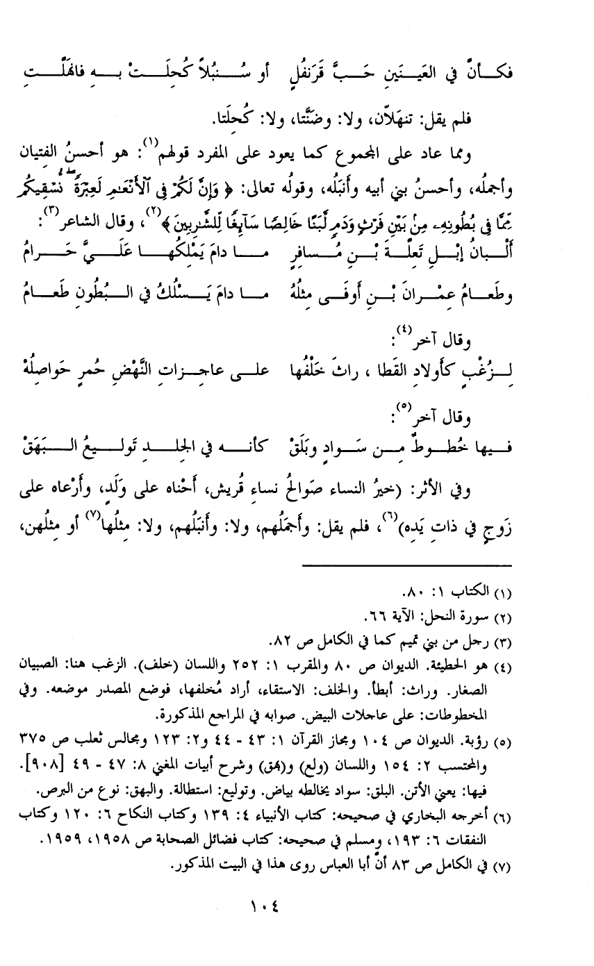 وفي الأثر: (خيرُ النساء صَوالحُ نساءِ قُريش، أَحْناه على وَلَدٍ، وأَرْعاه على زَوجٍ في ذاتِ يَدِه)، فلم يقل: وأَجمَلُهم، ولا: وأَنبَلُهم، ولا: مِثلُها أو مِثلُهن،