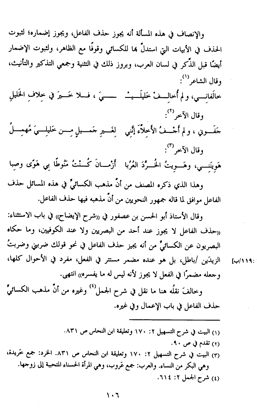 والإنصاف في هذه المسألة أنه يجوز حذف الفاعل، ويجوز إضماره؛ لثبوت الحذف في الأبيات التي استدلَّ بها للكسائي وقوفا مع الظاهر، ولثبوت الإضمار أيضا قبل الذِّكر في لسان العرب، وبروز ذلك في التثنية وجمعي التذكير والتأنيث، وقال الشاعر: