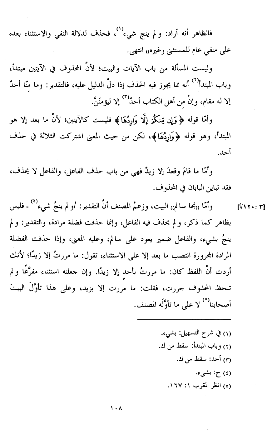 [٣: ١٢٠/أ] وأمّا "نجا سالم" البيت، وزعمُ المصنف أن التقدير: /ولم ينجُ شيء- فليس بظاهر كما ذكر، ولم يحذف فيه الفاعل، وإنما حذفت فضلة مرادة، والتقدير: ولم ينجُ بشيء، والفاعل ضمير يعود على سالم، وعليه المعنى، وإذا حذفت الفضلة المرادة المجرورة انتصب ما بعد إلا على الاستثناء، تقول: ما مررتُ إلا زيدًا؛ لأنك أردت أنَّ اللفظ كان: ما مررتُ بأحدٍ إلا زيدًا. وإن جعلته استثناء مفرَّغًا ولم تلحظ المحذوف جررت، فقلت: ما مررت إلا بزيد، وعلى هذا تأوَّلَ البيتَ أصحابنا لا على ما تأوَّلَه المصنف.