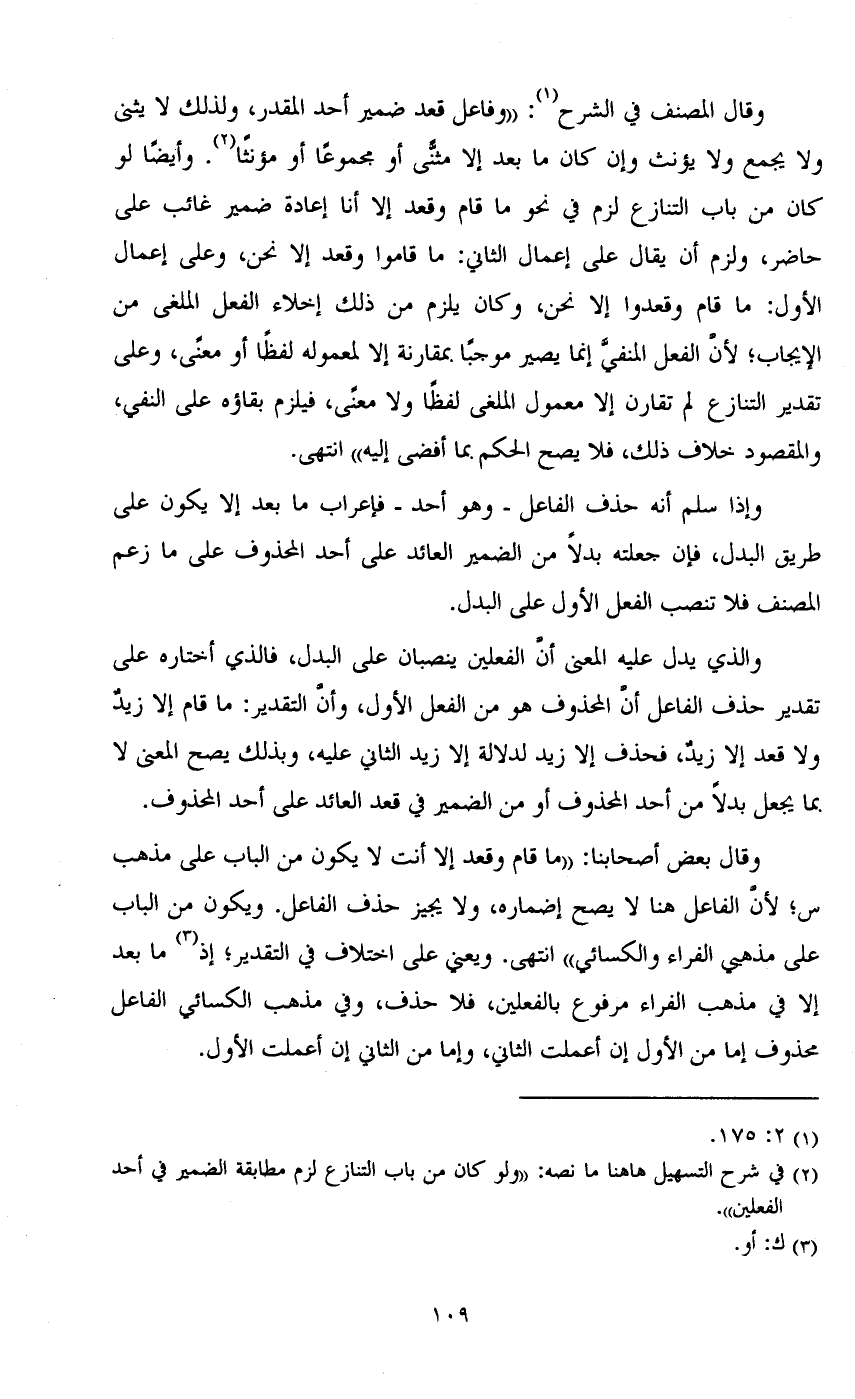 وقال المصنف في الشرح: "وفاعل قعد ضمير أحد المقدر، ولذلك لا يثني ولا يجمع ولا يؤنث وإن كان ما بعد إلا مثنًّى أو مجموعًا أو مؤنثًا. وأيضًا لو كان من باب التنازع لزم في نحو ما قام وقعد إلا أنا إعادة ضمير غائب على حاضر، ولزم أن يقال على إعمال الثاني: ما قاموا وقعد إلا نحن، وعلى إعمال الأول: ما قام وقعدوا إلا نحن، وكان يلزم من ذلك إخلاء الفعل الملغي من الإيجاب؛ لأنَّ الفعل المنفيَّ إنما يصير موجبًا بمقارنة إلا لمعموله لفظًا أو معنًى، وعلى تقدير التنازع لم تقارن إلا معمول الملغي لفظًا ولا معنًى، فيلزم بقاؤه على النفي، والمقصود خلاف ذلك، فلا يصح الحكم بما أفضى إليه" انتهى.