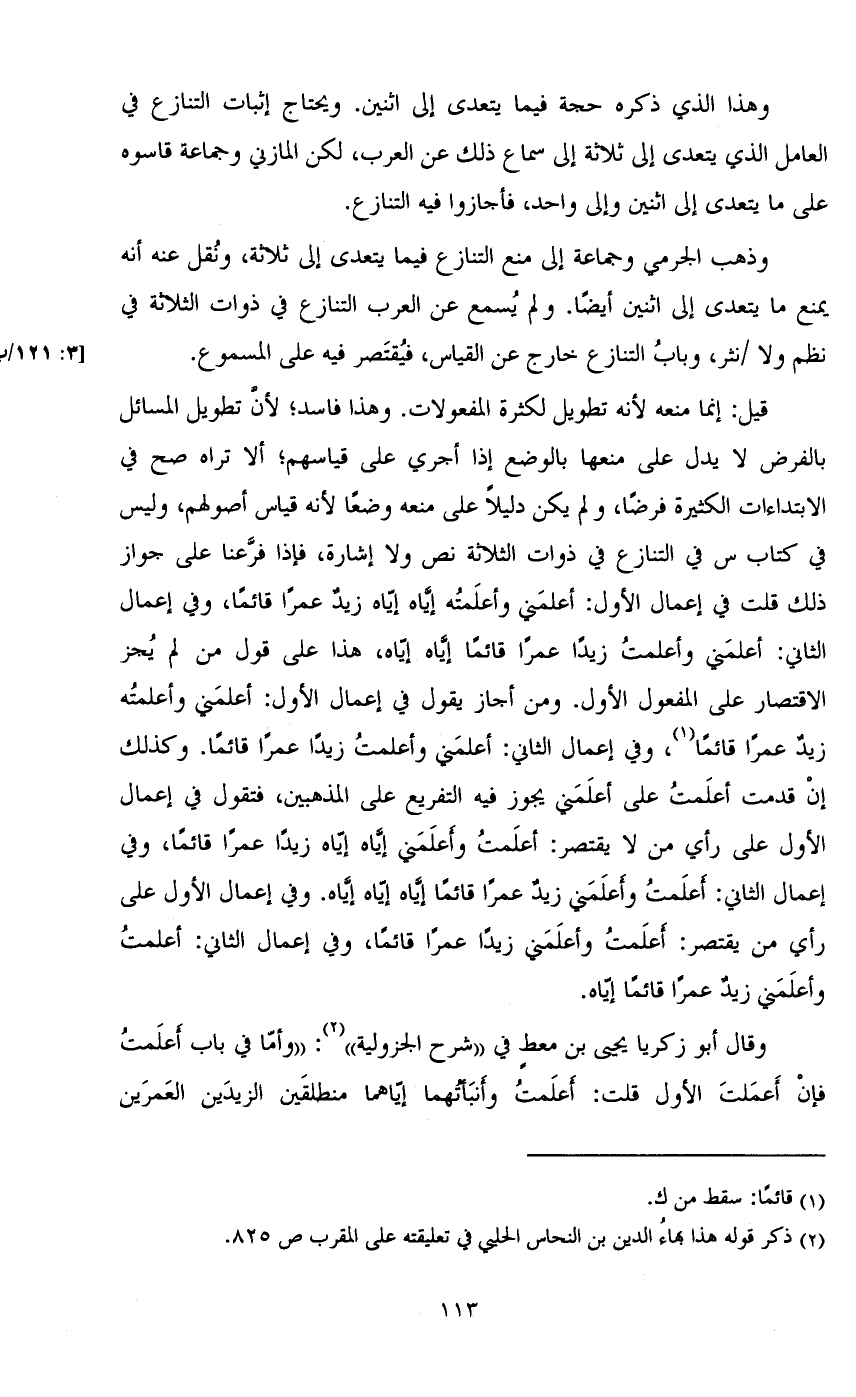 وذهب الجرمي وجماعة إلى منع التنازع فيما يتعدى إلى ثلاثة، ونقل عنه أنه يمنع ما يتعدى إلى اثنين أيضاً. ولم يسمع عن العرب التنازع في ذوات الثلاثة في نظم ولا /نثر، وباب التنازع خارج عن القياس، فيقتصر فيه على المسموع. ... [٣: ١٢١/ب]