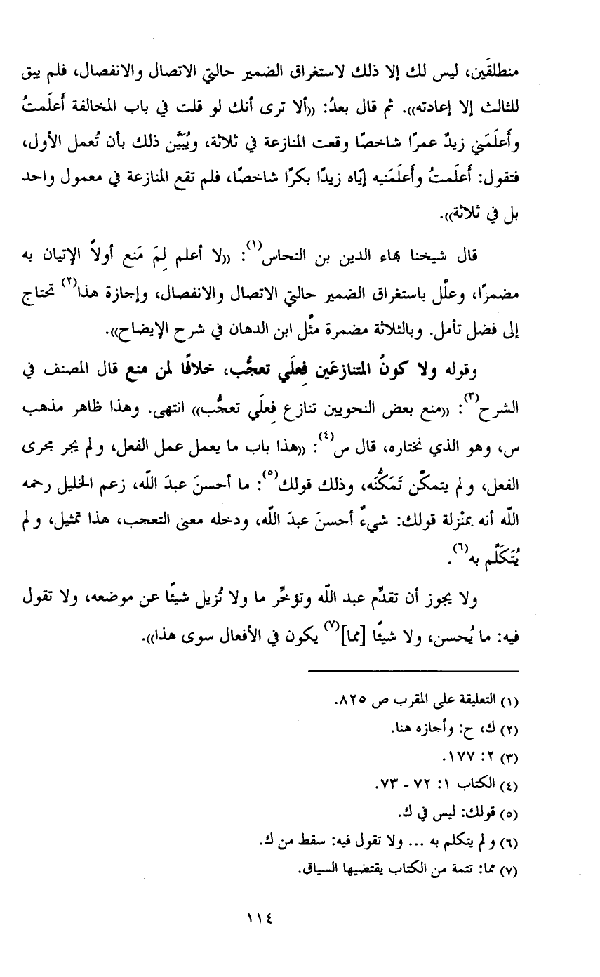 وقوله ولا كون المتنازعين فعلى تعجب، خلافاً لمن منع قال المصنف في الشرح: ((منع بعض النحويين تنازع فعلي تعجب)) انتهى. وهذا ظاهر مذهب س، وهو الذي نختاره، قال س: ((هذا باب ما يعمل عمل الفعل، ولم يجر مجرى الفعل، ولم يتمكن تمكنه، وذلك قولك: ما أحسن عبد الله، زعم الخليل رحمه الله أنه بمنزلة قولك: شيء أحسن عبد الله، ودخله معنى التعجب، هذا تمثيل، ولم يتكلم به.