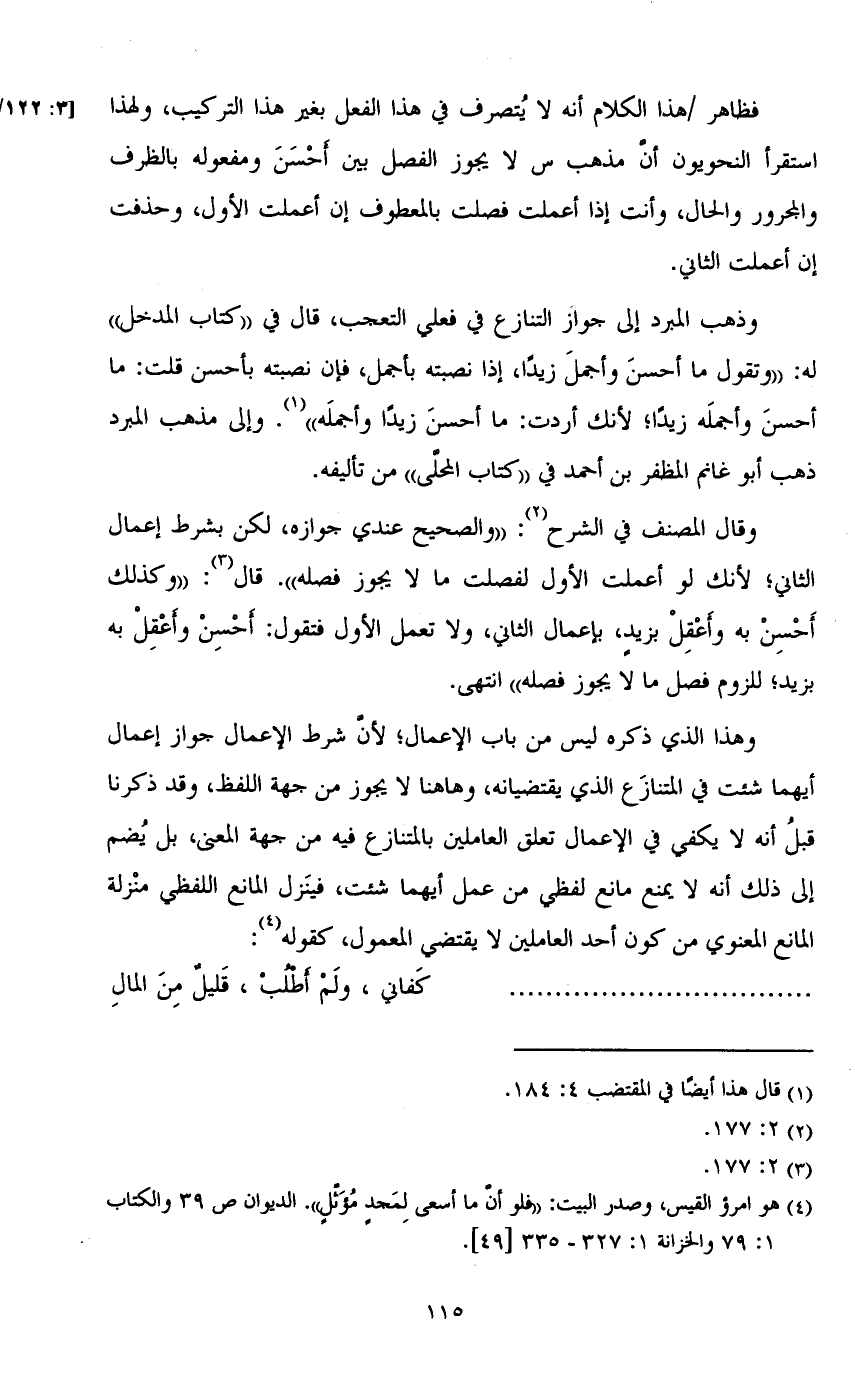 فظاهر/ هذا الكلام أنه لا يتصرف في هذا الفعل بغير هذا التركيب، ولهذا استقرأ النحويون أن مذهب س لا يجوز الفصل بين أحسن ومفعوله بالظرف المجرور والحال، وأنت إذا أعملت فصلت بالمعطوف إن أعملت الأول، وحذفت إن أعلمت الثاني. ... [٣: ١٢٢/أ]