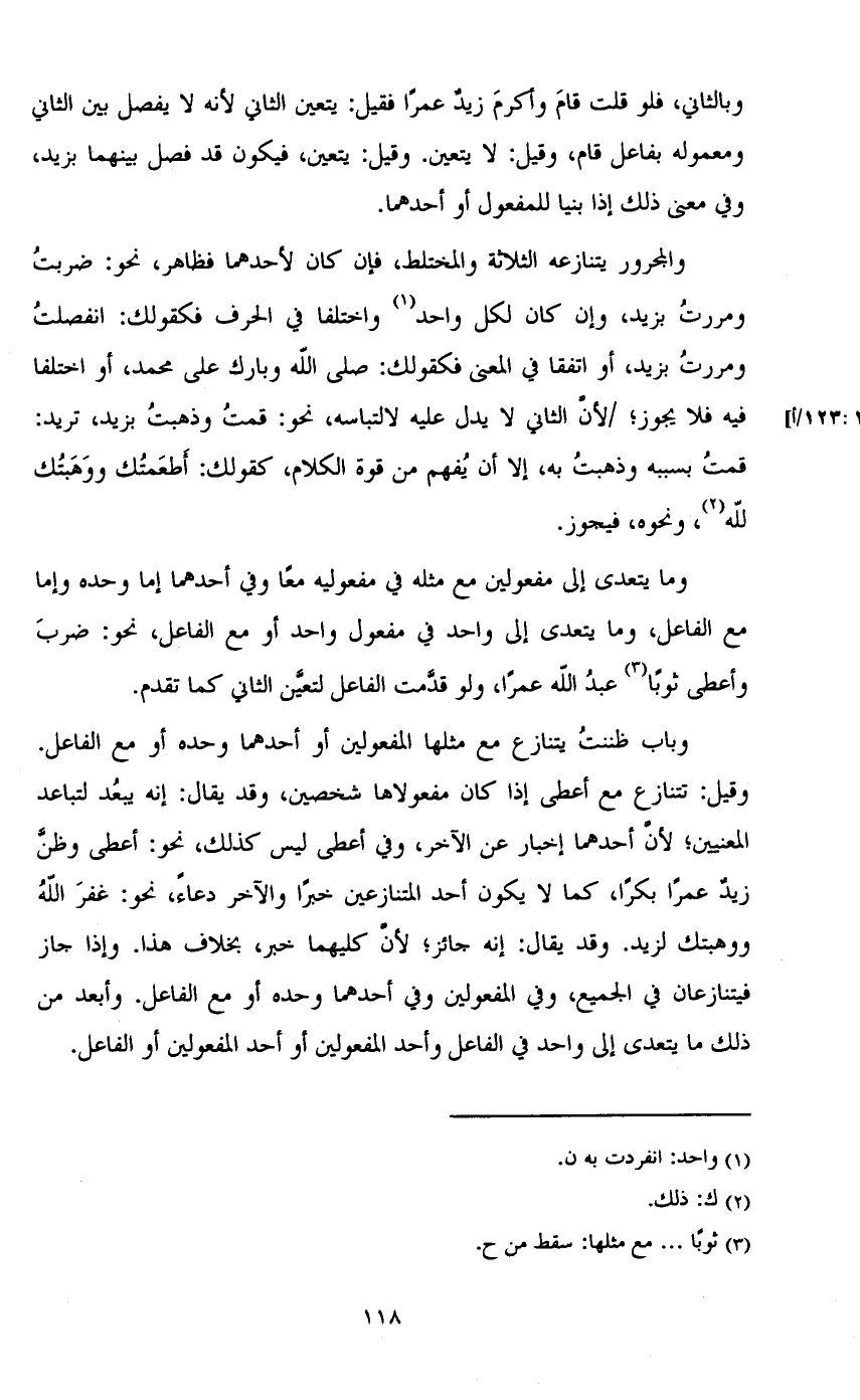 وباب ظننت يتنازع مع مثلها المفعولين أو أحدهما وحده أو مع الفاعل. وقيل: تتنازع مع اعطى إذا كان مفعولاها شخصين، وقد يقال: إنه يبعد لتباعد المعنيين؛ لأن أحدهما إخبار عن الآخر، وفي أعطى ليس كذلك، نحو: أعطى وطن زيد عمراً بكراً، كما لا يكون أحد المتنازعين خبراً والآخر دعاء، نحو: غفر الله ووهبتك لزيد. وقد يقال: إنه جائز؛ لن كليهما خبر، بخلاف هذا. وإذا جاز فيتنازعان في الجميع، وفي المفعولين وفي أحدهما وحده أو مع الفاعل. وأبعد من ذلك ما يتعدى إلى واحد في الفاعل وأحد المفعولين أو احد المفعولين أو الفاعل.
