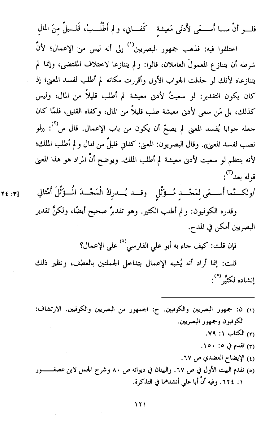اختلفوا فيه: فذهب جمهور البصريين إلى أنه ليس من الإعمال؛ لن شرطه أن يتنازع المعمول العاملان، قالوا: ولم يتنازعا لاختلاف المقتضى، وإنما لم يتنازعاه لأنك لو حذفت الجواب الأول وأقررت مكانه لم أطلب لفسد المعنى؛ إذ كان يكون التقدير: لو سعيت لأدنى معيشة لم أطلب قليلاً من المال، وليس كذلك، بل من سعى لأدنى معيشة طلب قليلاً من المال، وكفاه القليل، فلما كان جعله جوابا يُفسد المعنى لم يصح أن يكون من باب الإعمال. قال س: ((لو نصب لفسد المعنى)). وقال البصريون: المعنى: كفاني قليل من المال ولم أطلب الملك؛ لأنه ينتظم لو سعيت لأدنى معيشة لم أطلب الملك. ويوضح ان المراد هو هذا المعنى قوله بعد: