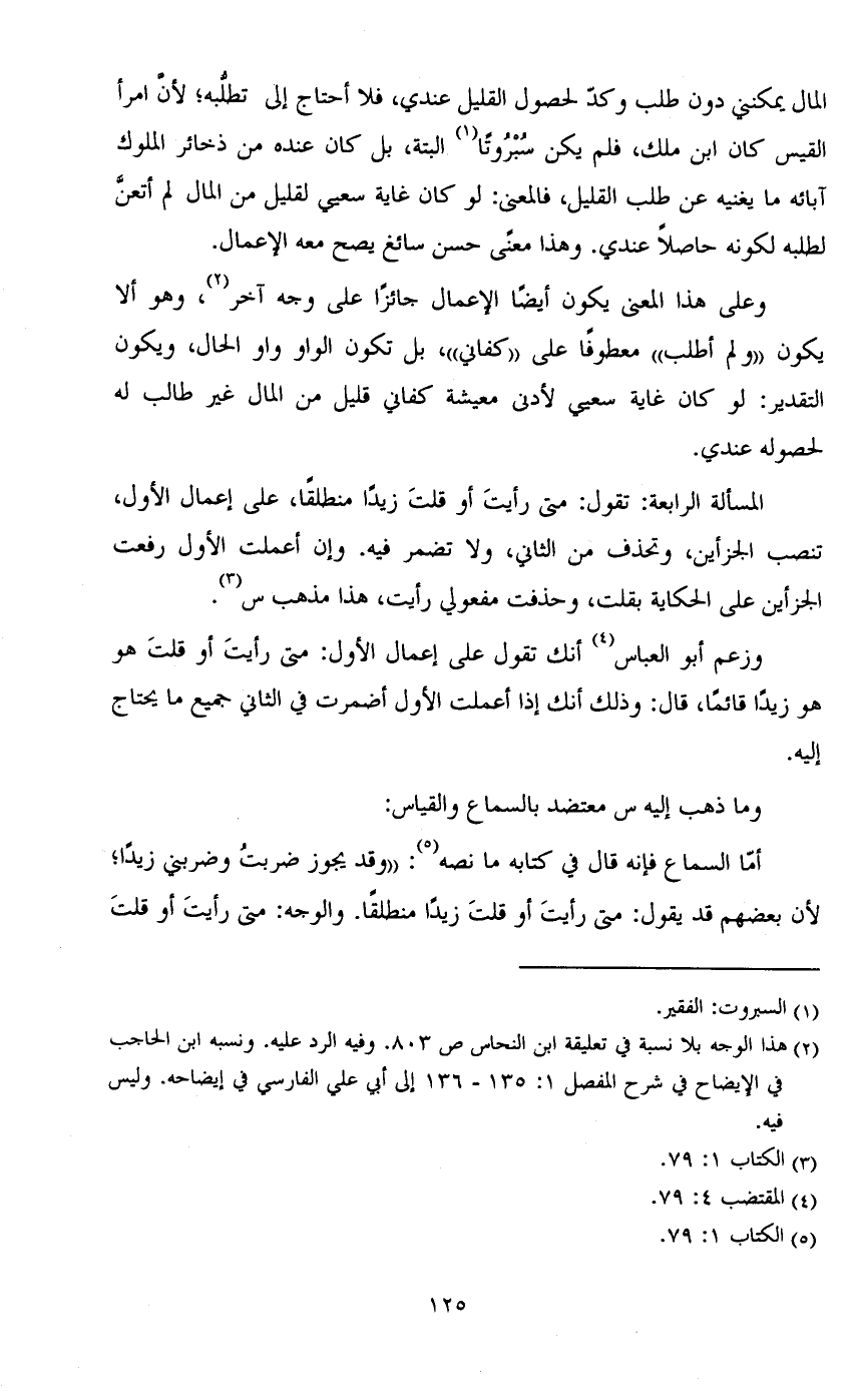 المسألة الرابعة: تقول: متى رأيت أو قلت زيداً منطلقاً، على إعمال الأول، تنصب الجزأين، وتحذف من الثاني، ولا تضمر فيه. وإن أعملت الأول رفعت الجزأين على الحكاية بقلت، وحذفت مفعولي رأيت، هذا مذهب س.
