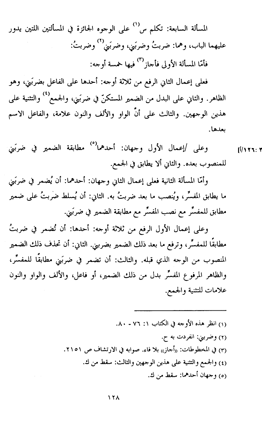 المسألة السابعة: تكلم س على الوجه الجائزة في المسألتين اللتين يدور عليهما الباب، وهما: ضربت وضربني، وضربني وضربت: