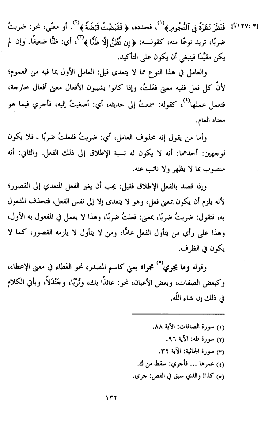 وأما من يقول إنه محذوف العامل، أي: ضربت ففعلت ضرباً- فلا يكون لوجهين: أحدهما: أنه لا يكون له نسبة الإطلاق إلى ذلك الفعل. والثاني: أنه منصوب بما لا يظهر ولا نائب عنه.