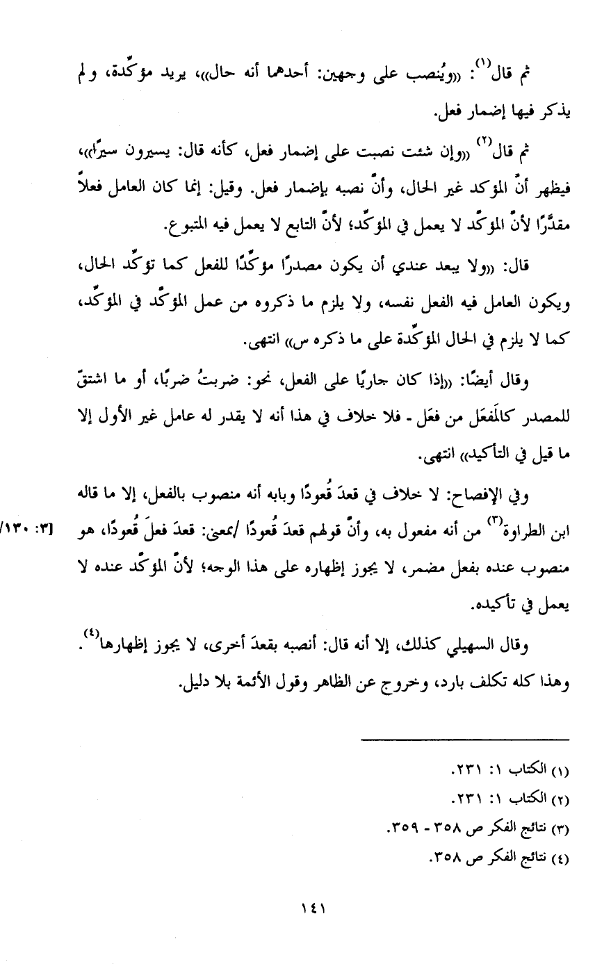 ثم قال ((وإن شئت نصبت على إضمار فعل، كأنه قال: يسيرون سيراً))، فيظهر أن المؤكد غير الحال، وأن نصبه بإضمار فعل. وقيل: إنما كان العامل فعلاً مقدراً لأن المؤكد لا يعمل في المؤكد؛ لأن التابع لا يعمل فيه المتبوع.