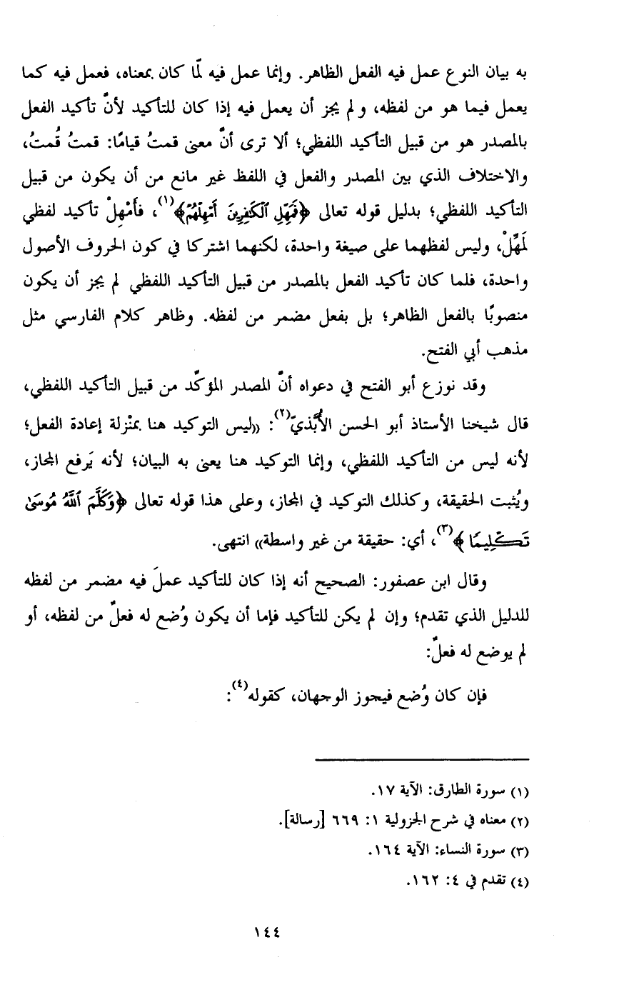 وقد نوزع أبو الفتح في دعواه أن المصدر المؤكد من قبيل التأكيد اللفظي، قال شيخنا الأستاذ أبو الحسن الأبذي: ((ليس التوكيد هنا بمزلة إعادة الفعل؛ لأنه ليس من التأكيد اللفظي، وإنما التوكيد هنا يعني به البيان؛ لأنه يرفع المجاز، ويثبت الحقيقة، وكذلك التوكيد في المجاز، وعلى قوله تعالى {وَكَلَّمَ اللَّهُ مُوسَى تَكْلِيمًا}، أي: حقيقة من غير واسطة)) انتهى.