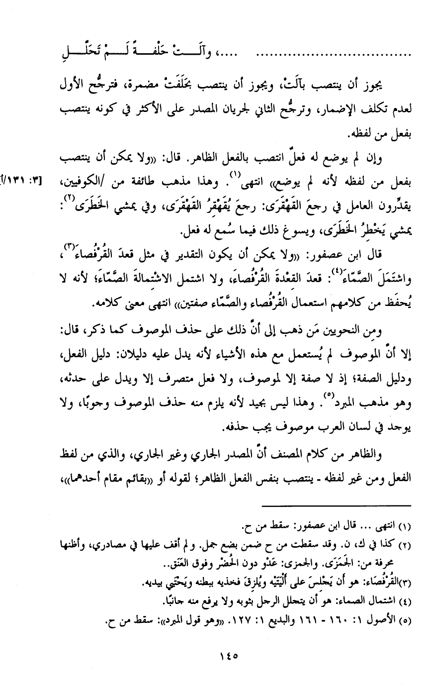 ومن النحويين من ذهب إلى أن ذلك على حذف الموصوف كما ذكر، قال: إلا أن الموصوف لم يستعمل مع هذه الأشياء لأنه يدل عليه دليلان: دليل الفعل، ودليل الصفة؛ إذ لا صفة إلا لموصوف، ولا فعل متصرف إلا ويدل على حدثه، وهو مذهب المبرد. وهذا ليس بجيد لأنه يلزم منه حذف الموصوف وجوباً، ولا يوجد في لسان العرب موصوف يجب حذفه.