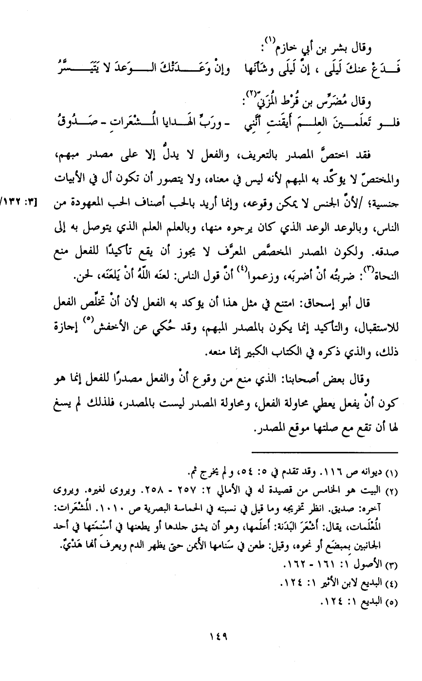 فقد اختص المصدر بالتعريف، والفعل لا يدل إلا على مصدر مبهم، والمختص لا يؤكد به المبهم لأنه ليس في معناه، ولا يتصور أن تكون أل في الأبيات جنسية؛ /لأن الجنس لا يمكن وقوعه، وإنما أريد بالحب أصناف الحب المعهودة من الناس، وبالوعد الوعد الذي كان يرجوه منا، وبالعلم العلم الذي يتوصل به إلى صدقه. ولكون المصدر المخصص المعرف لا يجوز أن يقع تأكيداً للفعل منه النحاة: ضربته أن أضربه، وزعموا أن قول الناس: لعنه الله أن يلعنه، لحن. ... [٣: ١٣٢/أ]