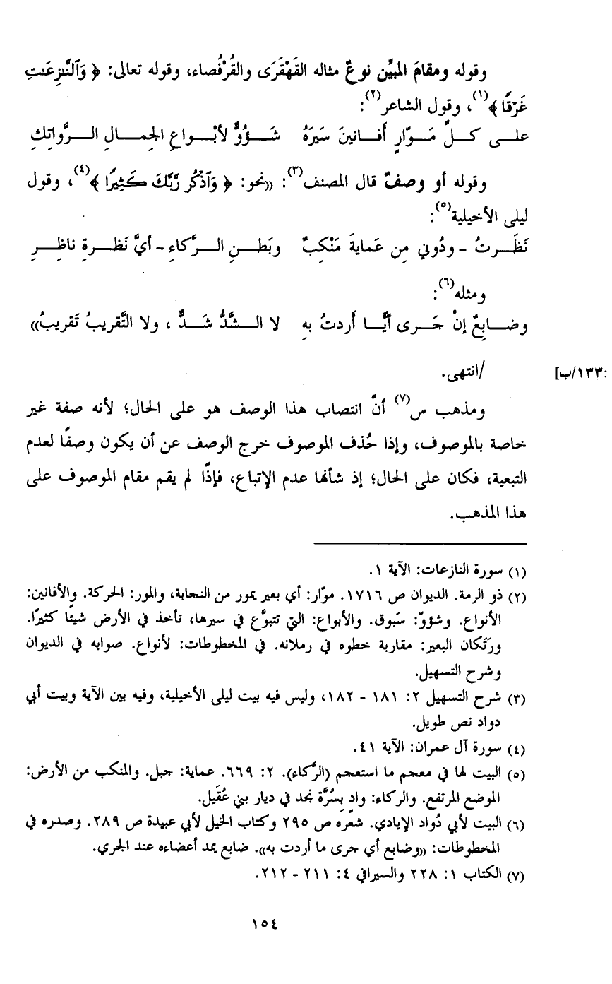 ومذهب س أن انتصاب هذا الوصف هو على الحال؛ لأنه صفة غير خاصة بالموصوف، وإذا حذف الموصوف خرج الوصف عن أن يكون وصفَا لعدم التبعية، فكان على الحال؛ إذ شأنها عدم الإتباع، فإذَا لم يقم مقام الموصوف على هذا المذهب.