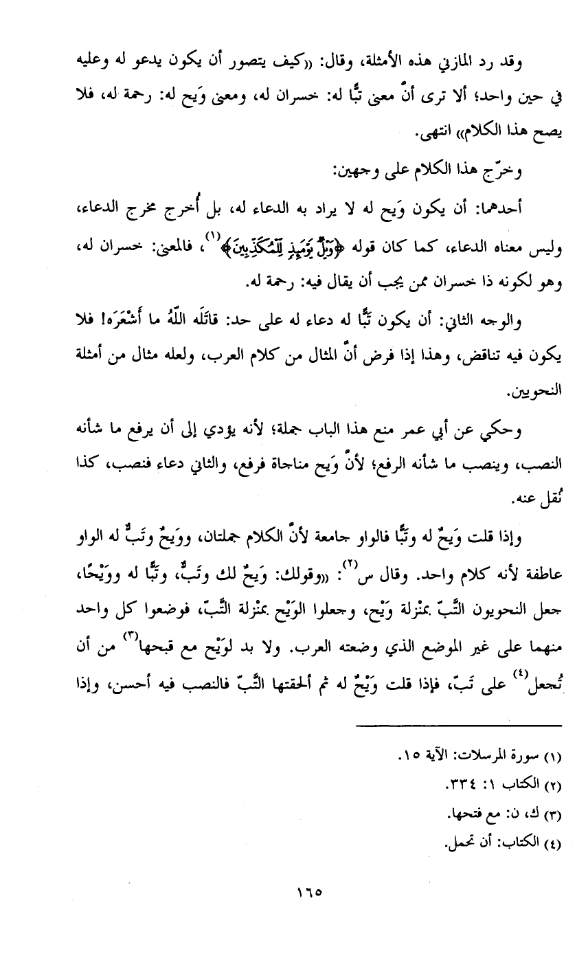 وإذا قلت ويح له وتبا فالواو جامعة لأن الكلام جملتان، وويح وتب له الواو عاطفة لأنه كلام واحد. وقال س: ((وقولك: ويح لك وتب، وتبا له وويحا، جعل النحويون التب بمنزلة ويح، وجعلوا الويح بمنزلة التب، فوضعوا كل واحد منهما على غير الموضع الذي وضعته العرب. ولا بد لويح مع قبحها من أن تجعل على تب، فإذا قلت ويح له ثم ألحقتها التب فالنصب فيه أحسن، وإذا