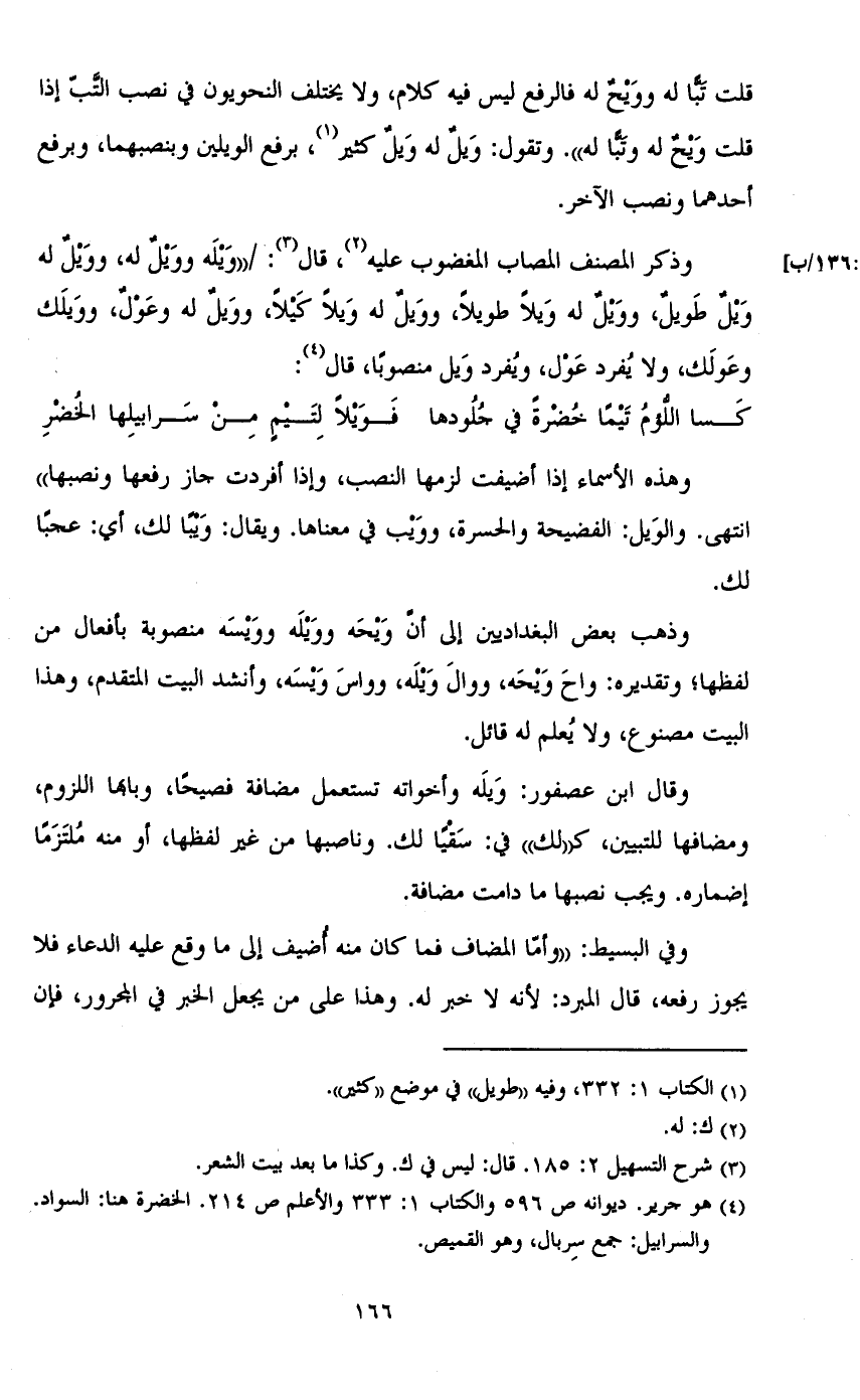 وذكر المصنف المصاب المغضوب عليه، قال: / ((ويله وويل له، وويل له ويل طويل، وويل له ويلاَ طويلاَ، وويل له ويلا كيلا, وويل له وعول, وويلك وعولك، ولا يفرد عول، ويفرد ويل منصوبا، قال (٤):